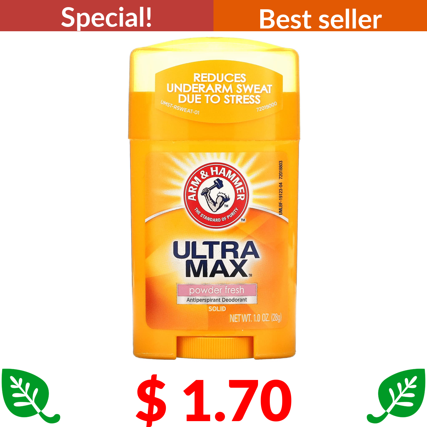 $ 1.70 Arm & Hammer, UltraMax, Solid Antiperspirant Deodorant, Powder Fresh, 1 oz (28 g)
