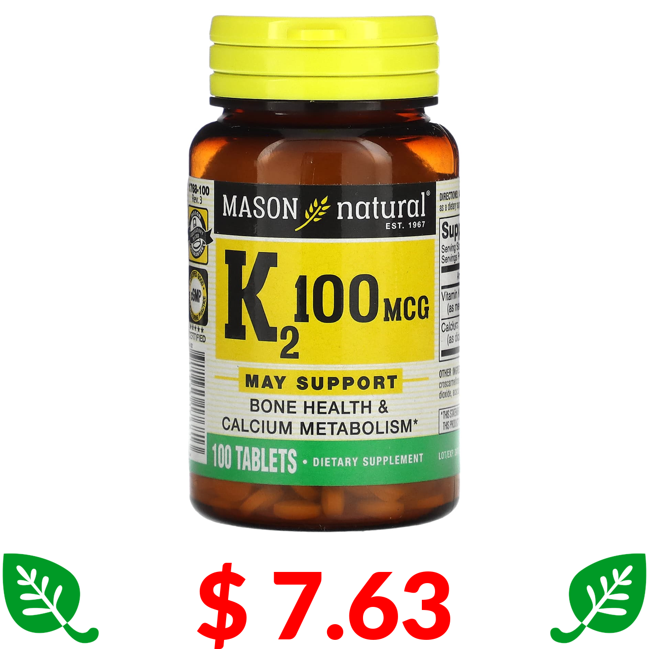 $ 7.63 Mason Natural, Vitamin K2, 100 mcg, 100 Tablets