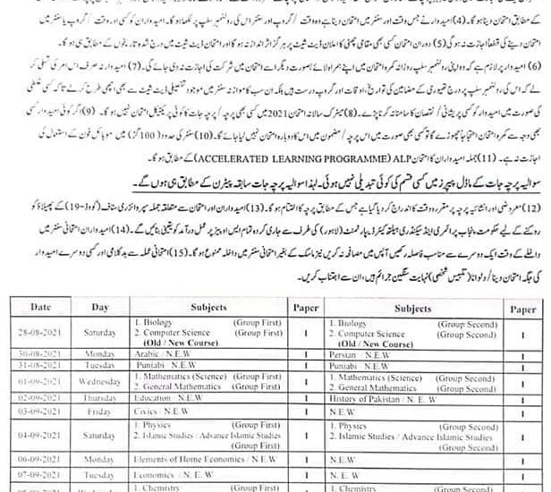 9th Class Date Sheet 2021 For All BISE Boards of Pakistan