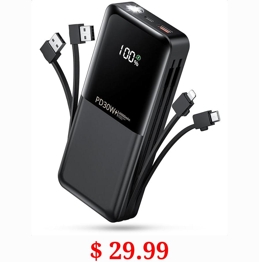 $ 29.99 Power-Bank-Portable-Phone-Charger - 40000mAh Power Bank PD30W Fast Charger Built-in 2 Detachable Output Cables, Flashlight and LED Display for iPhone and Android Phones and Most Electronic Devices
