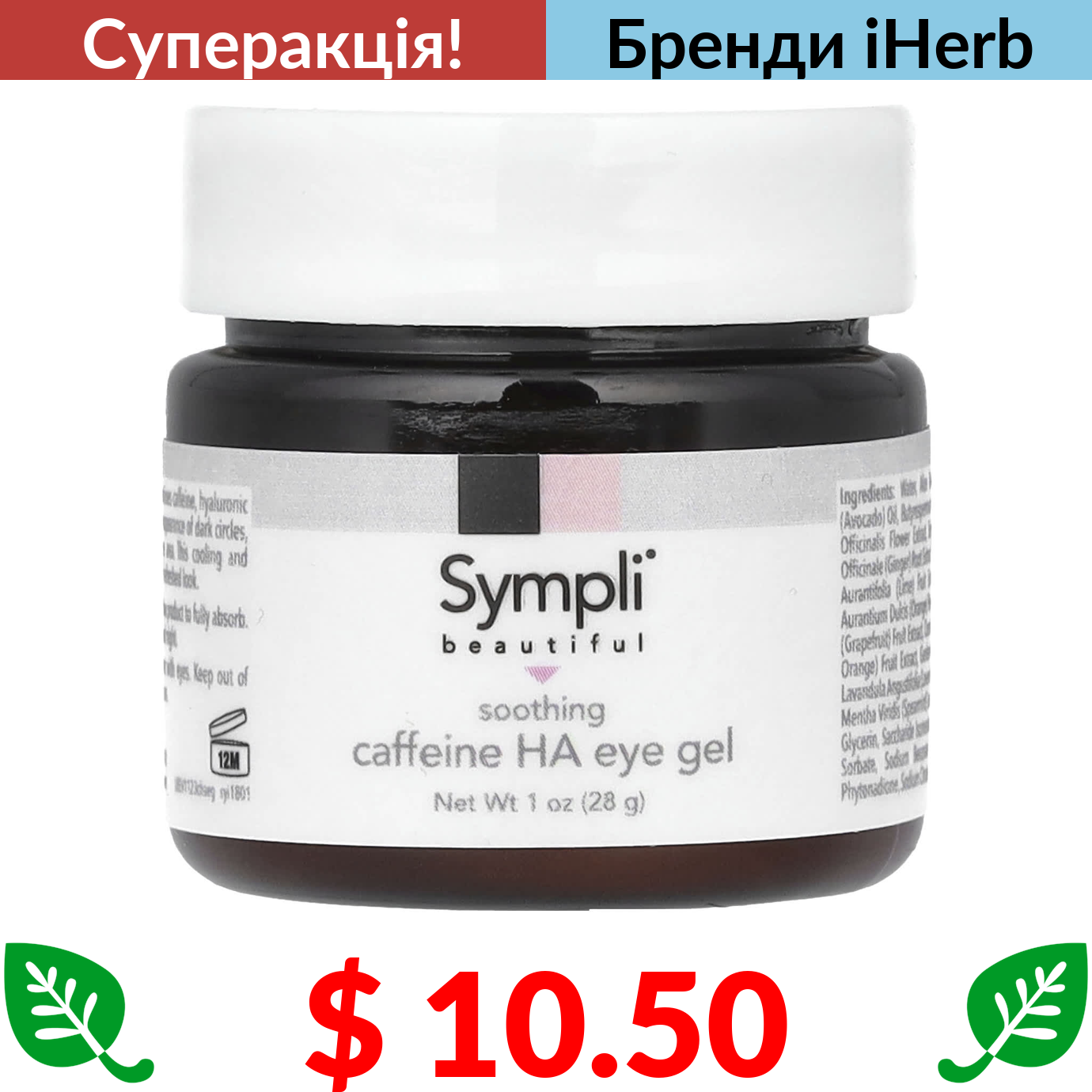 $ 10.50 Sympli Beautiful, заспокійливий гель для шкіри навколо очей із кофеїном і гіалуроновою кислотою, 28 мл (1 унція)