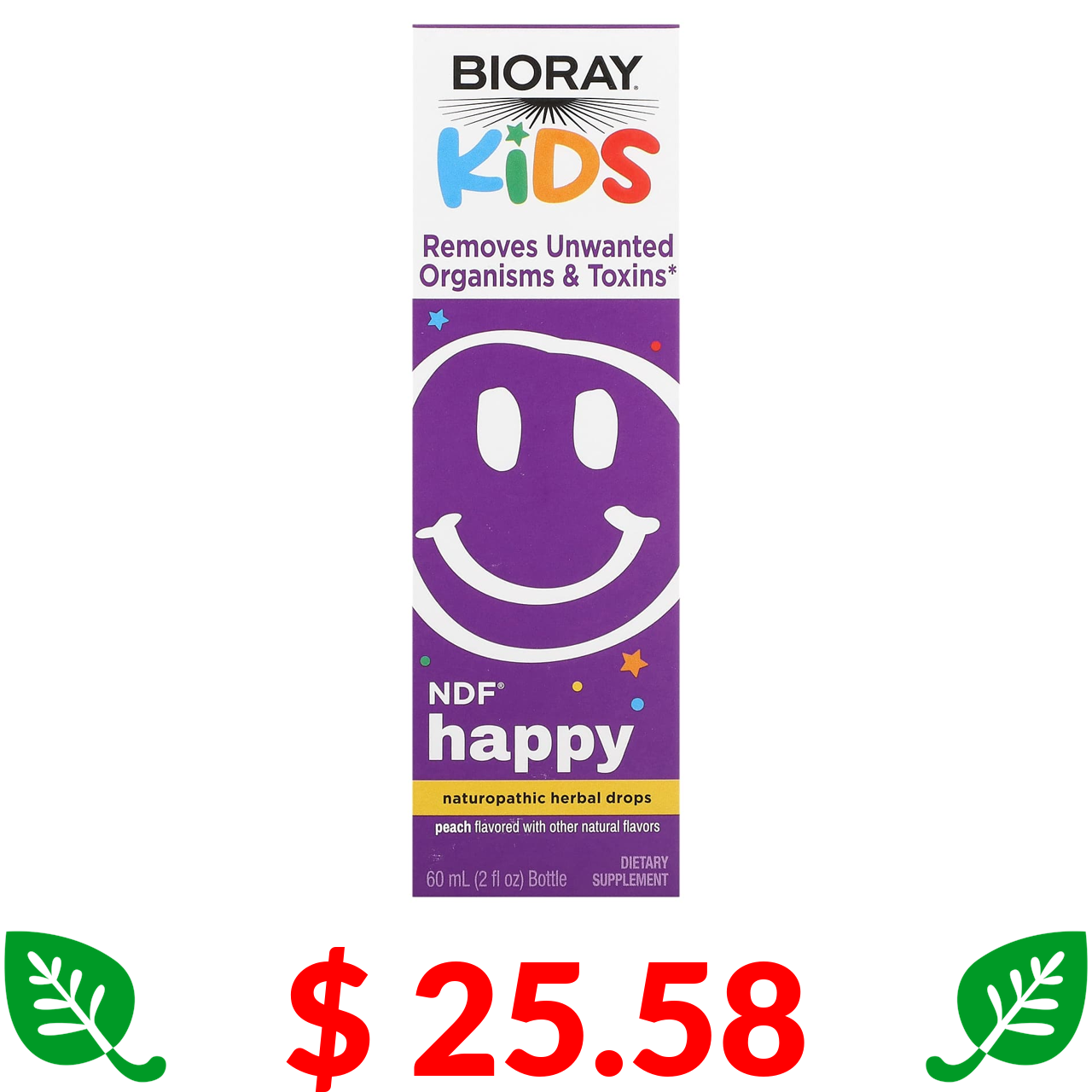 $ 25.58 Bioray, NDF Happy, видаляє небажані мікроорганізми та токсини, для дітей, з ароматом персика, 60 мл (2 рідк. унції)