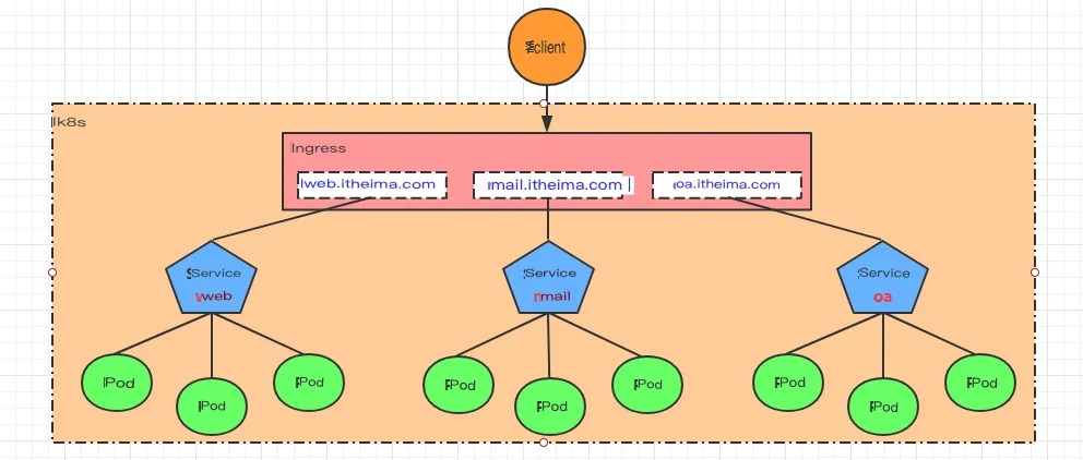 Based on this situation, Kubernetes provides the Ingress resource object, which only needs a NodePort or an LB to satisfy the needs of exposing multiple Services. The working mechanism is roughly represented in the following figure: