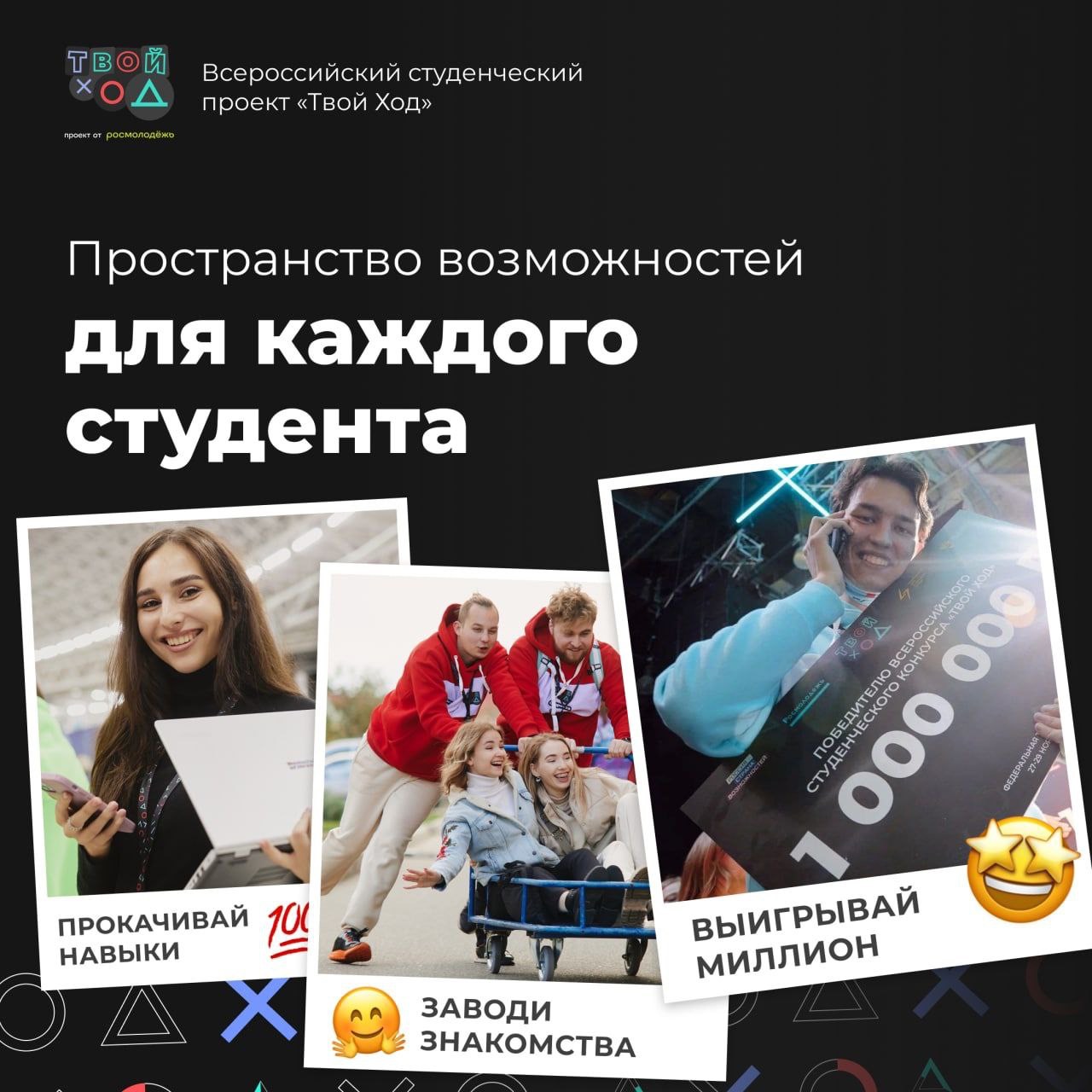 «Твой Ход» — это проект для студентов. Каждому участнику он поможет определить свой потенциал, прокачать профессиональные навыки, разработать личную траекторию развития и превратить своё время в пользу для себя, друзей, близких, вуза, города, страны.