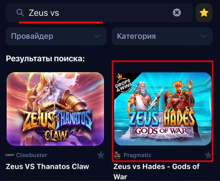 После пишем в строку поиска «Zeus vs Hades и переходим по данному слоту: