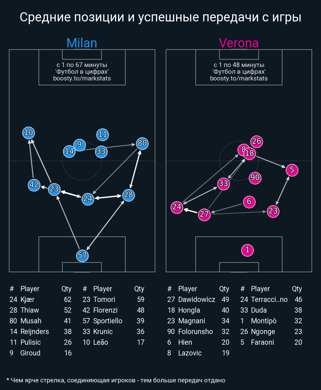 55 успешных передач из 66 попыток (4 с продвижением, 1 на трети соперника)