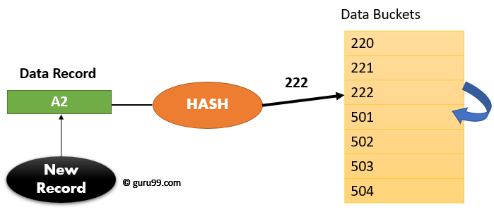 For example, A2 is a new record which you wants to insert. The hash function generates address as 222. But it is already occupied by some other value. That’s why the system looks for the next data bucket 501 and assigns A2 to it.