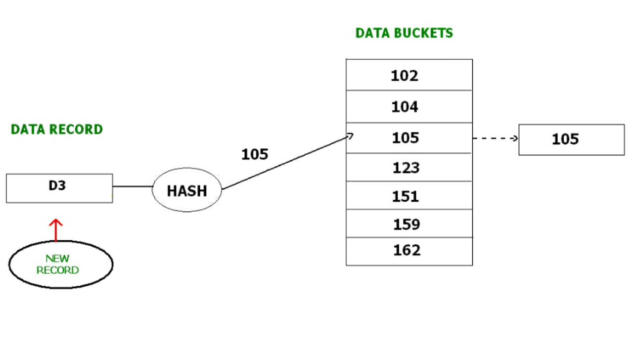 For example, we have to insert a new record D3 into the tables. The static hash function generates the data bucket address as 105. But this bucket is full to store the new data. In this case is a new data bucket is added at the end of 105 data bucket and is linked to it. Then new record D3 is inserted into the new bucket.