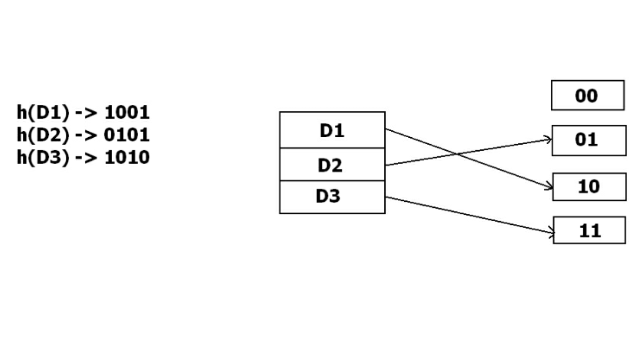 But the problem is that No bucket address is remaining for D3. The bucket has to grow dynamically to accommodate D3. So it changes the address have 2 bits rather than 1 bit, and then it updates the existing data to have 2 bit address. Then it tries to accommodate D3.