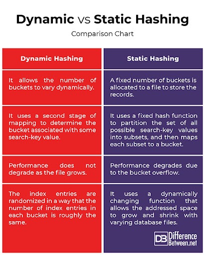 The drawback of static hashing is that that it does not expand or shrink dynamically as the size of the database grows or shrinks. In Dynamic hashing, data buckets grows or shrinks (added or removed dynamically) as the records increases or decreases. Dynamic hashing is also known as extended hashing.