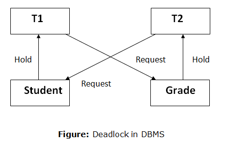 For example: In the student table, transaction T1 holds a lock on some rows and needs to update some rows in the grade table. Simultaneously, transaction T2 holds locks on some rows in the grade table and needs to update the rows in the Student table held by Transaction T1.