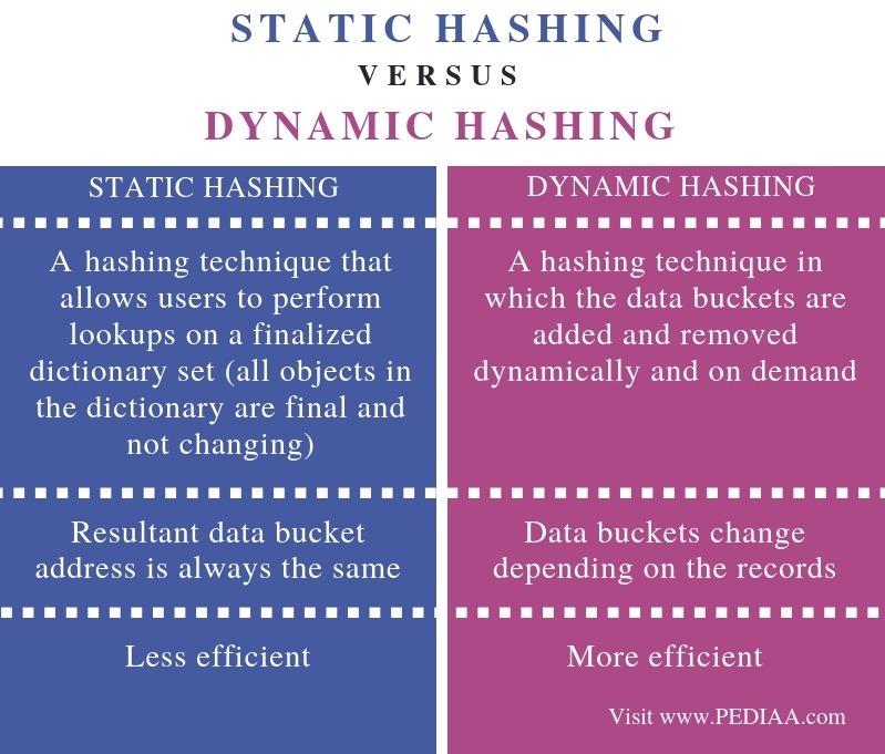 Dynamic hashing offers a mechanism in which data buckets are added and removed dynamically and on demand. In this hashing, the hash function helps you to create a large number of values.