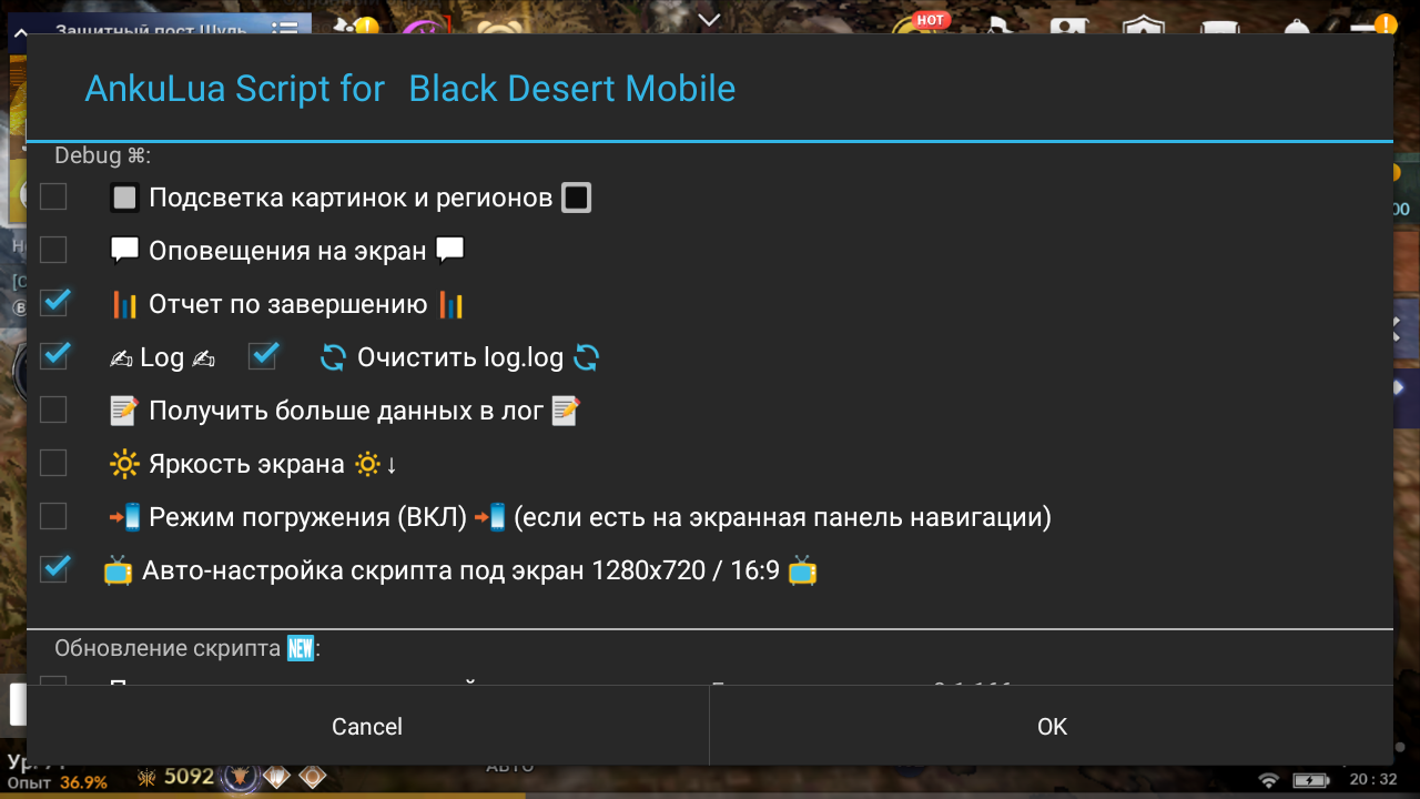 Скрипт работает и на остальных разрешениях при соотношении экрана 16:9 ( 1920x1080, 1600x900, 1280x720, 960x540 ) используя картинки с 1280x720, если же у вас другие параметры, необходимо вырезать новые картинки, т.к. AnkuLua будет пытаться растягивать имеющиеся и работать не будет