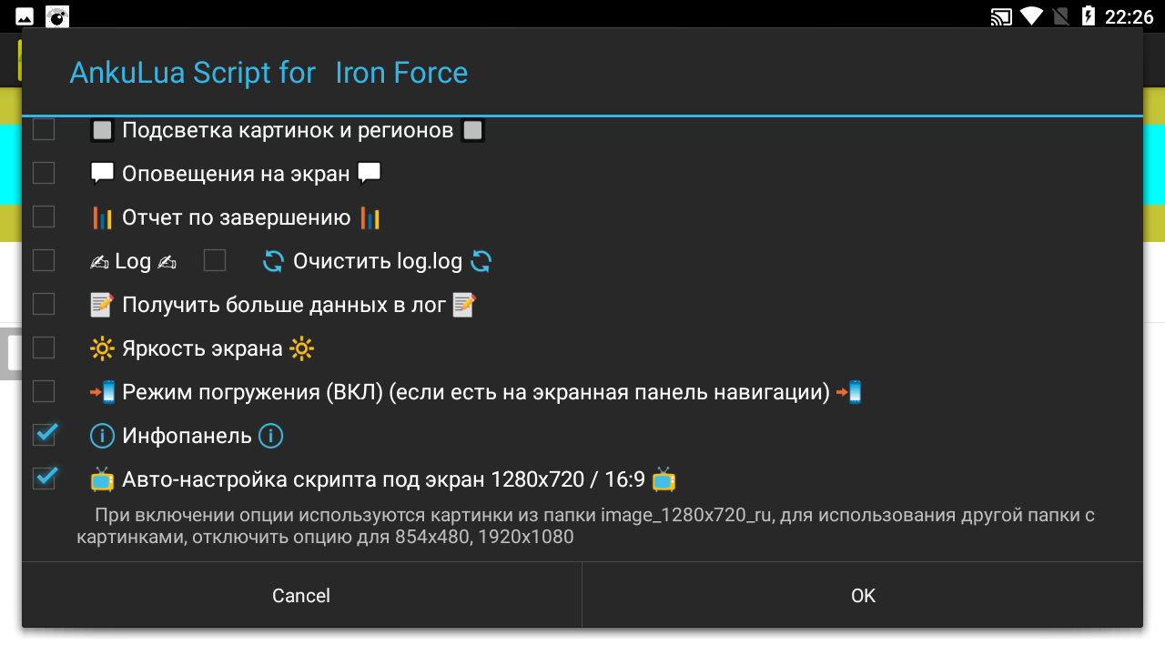 К сожалению в этой игре скрипт не работает на остальных разрешениях при соотношении экрана 16:9 ( 1920x1080, 1600x900, 1280x720, 960x540 ) используя картинки с 1280x720. Если же у вас другие размеры экрана, необходимо будет вырезать новые картинки, т.к. AnkuLua будет пытаться растягивать имеющиеся и работать не будет