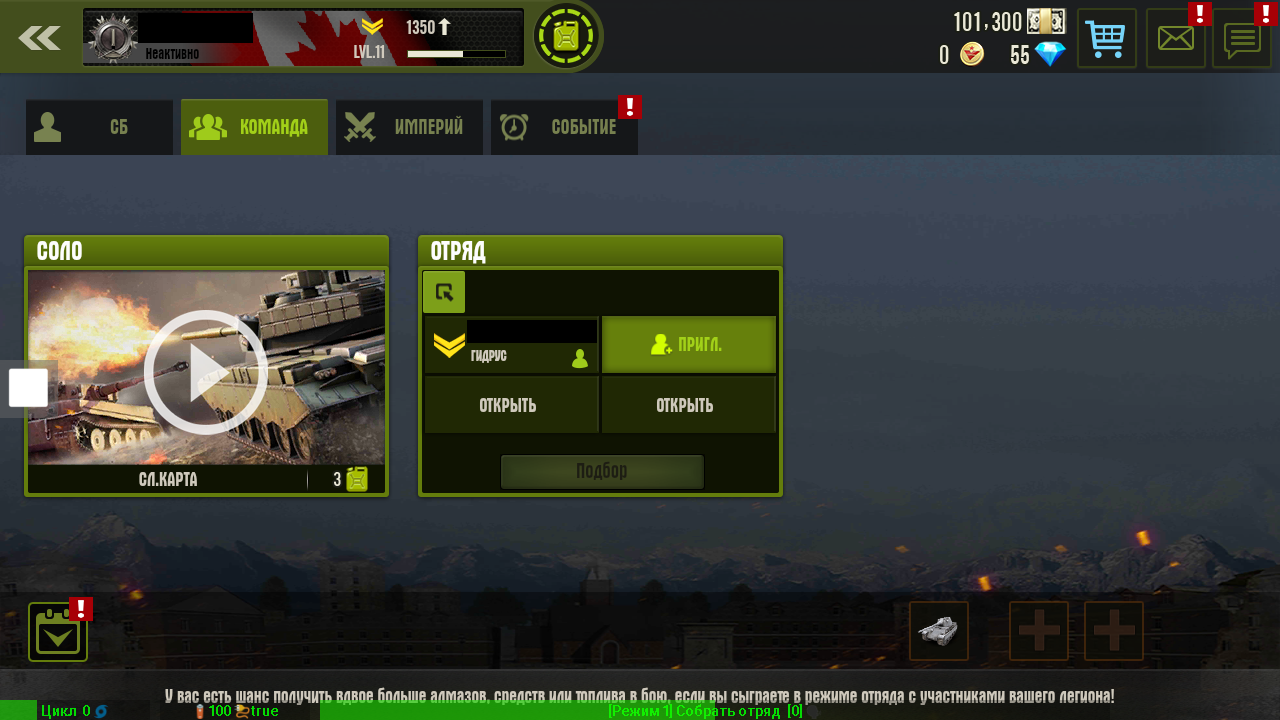 Режим 1: Создать отряд и пригласить в него. После присоединения напарника начинается подбор противников и игра начнет загружать локацию, скрипт выходит из игры, до списания баков