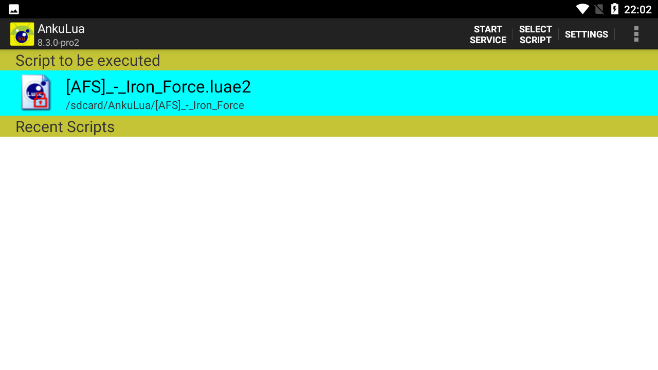 - Done. Press Select Script, select the file [AFS]_-_Iron_Force.luae2 and run.