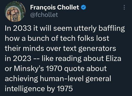 Подобные споры идут в вялотекущем режиме постоянно, но точкой взрыва сейчас стали выход GPT-4 и открытое письмо, предлагающее остановить AI-рисёч на полгода. На эту тему уже так или иначе высказались все большие ML-специалисты, кто-то (например, Ян Лекун и Франсуа Шолле) откровенно смеётся над волной истерии.