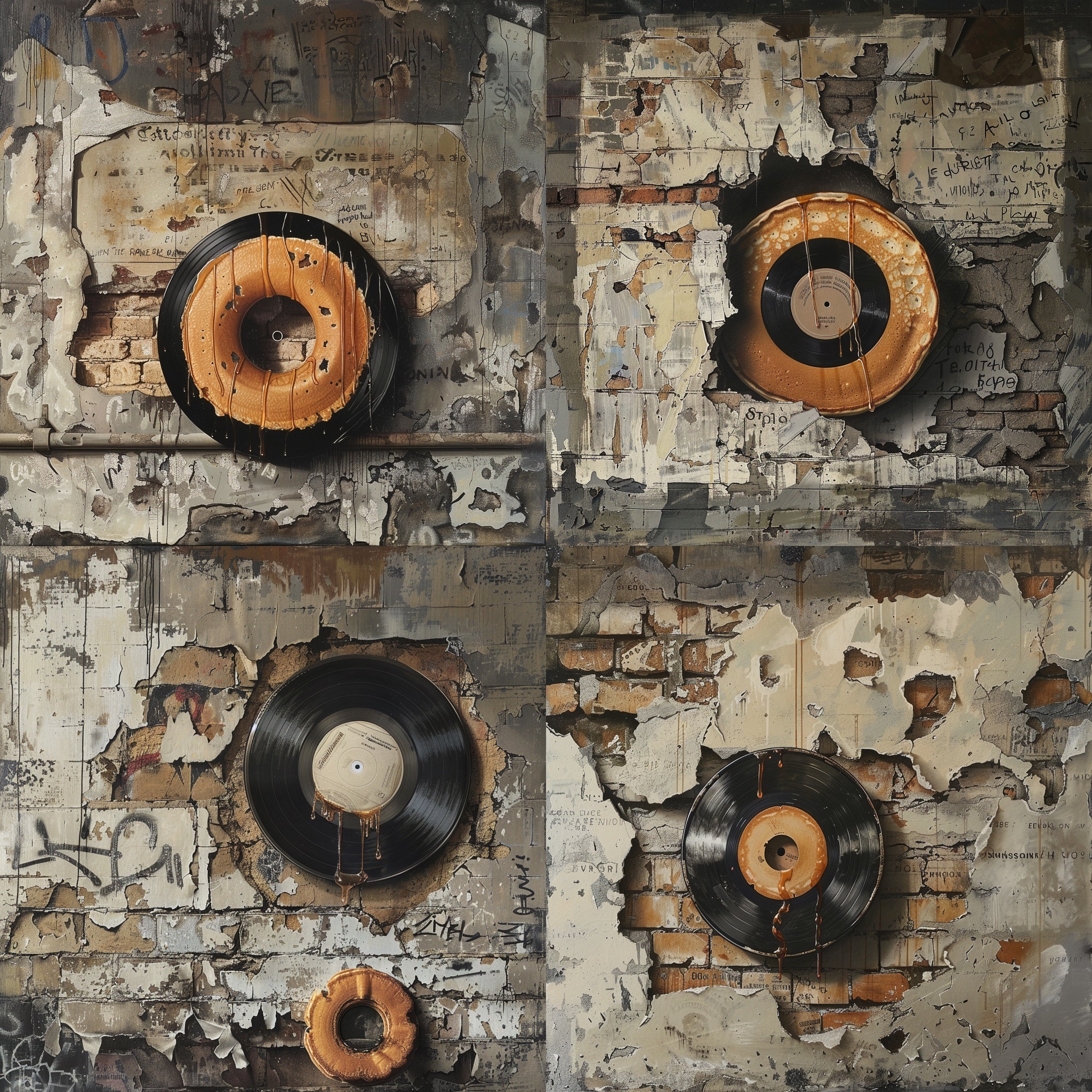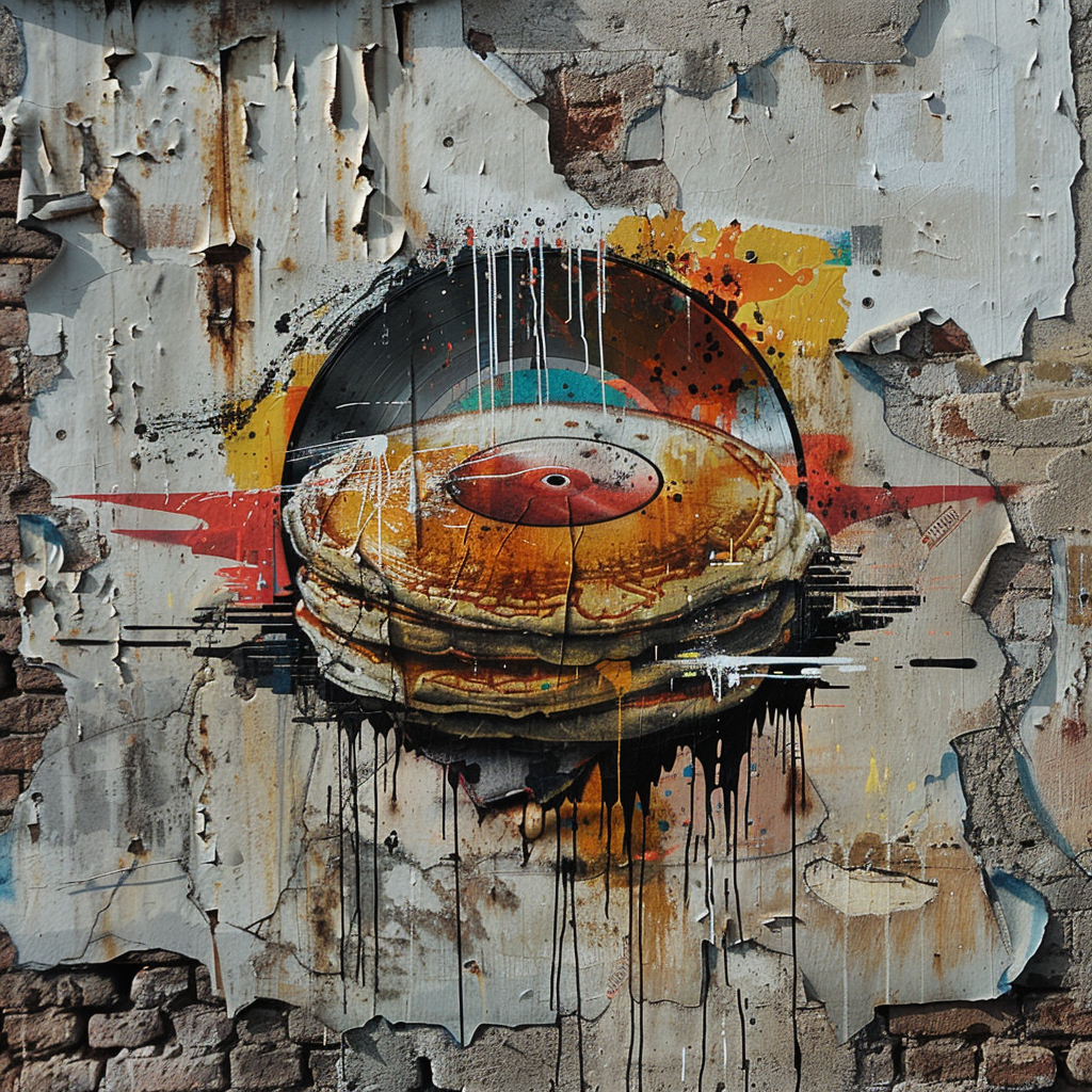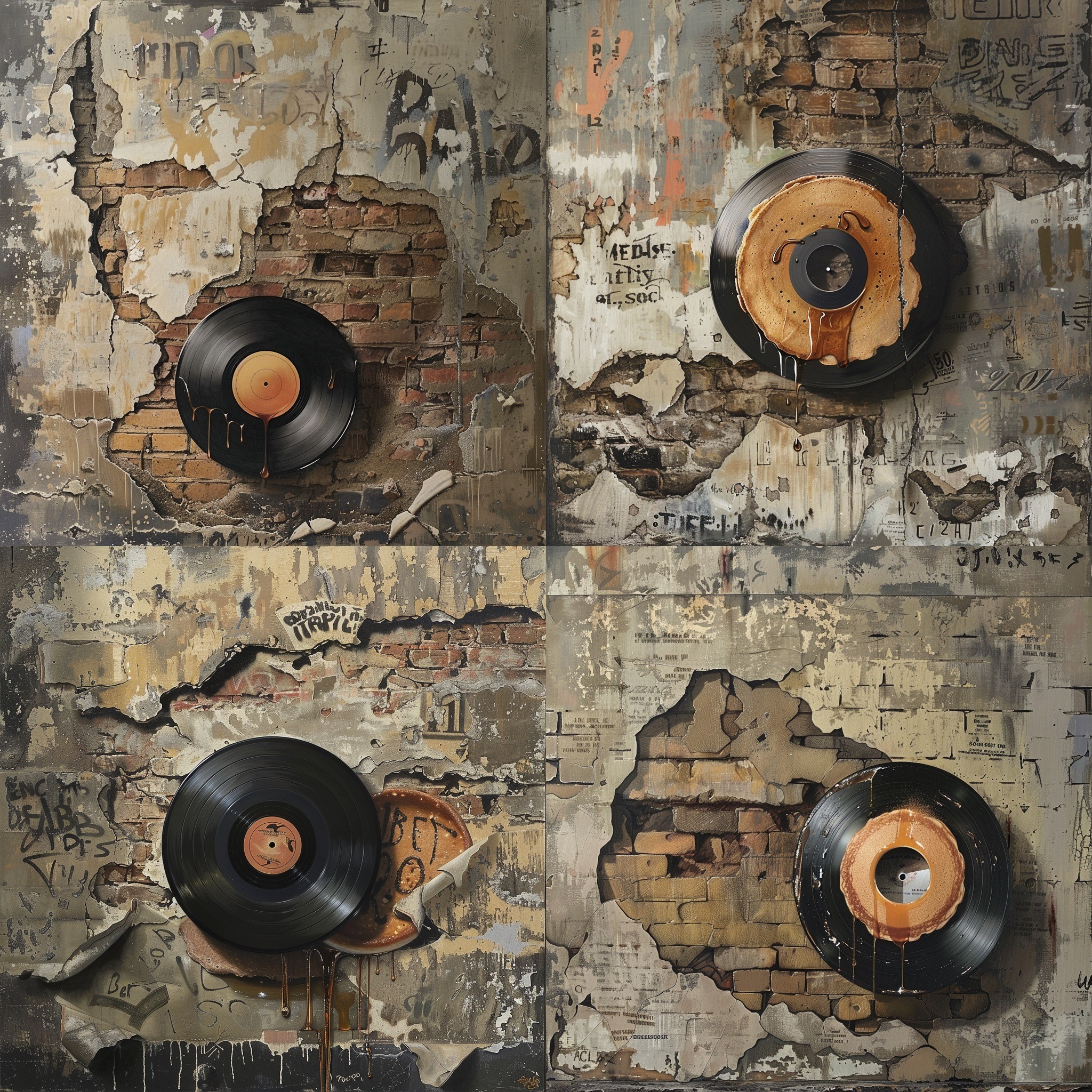 A photorealistic depiction of a graffiti on a crumbling plaster wall of an abandoned building, showcasing an edible pancake designed like a classic vinyl record, embodying minimalism. The background subtly hints at the building's forgotten history with faded letters and numbers. The pancake-record is detailed, with syrup grooves mimicking record grooves, under soft, diffused lighting. Created Using: digital painting, realism, attention to texture detail, photorealistic shading, ambient lighting, subdued color palette, historical undertones, tactile realism