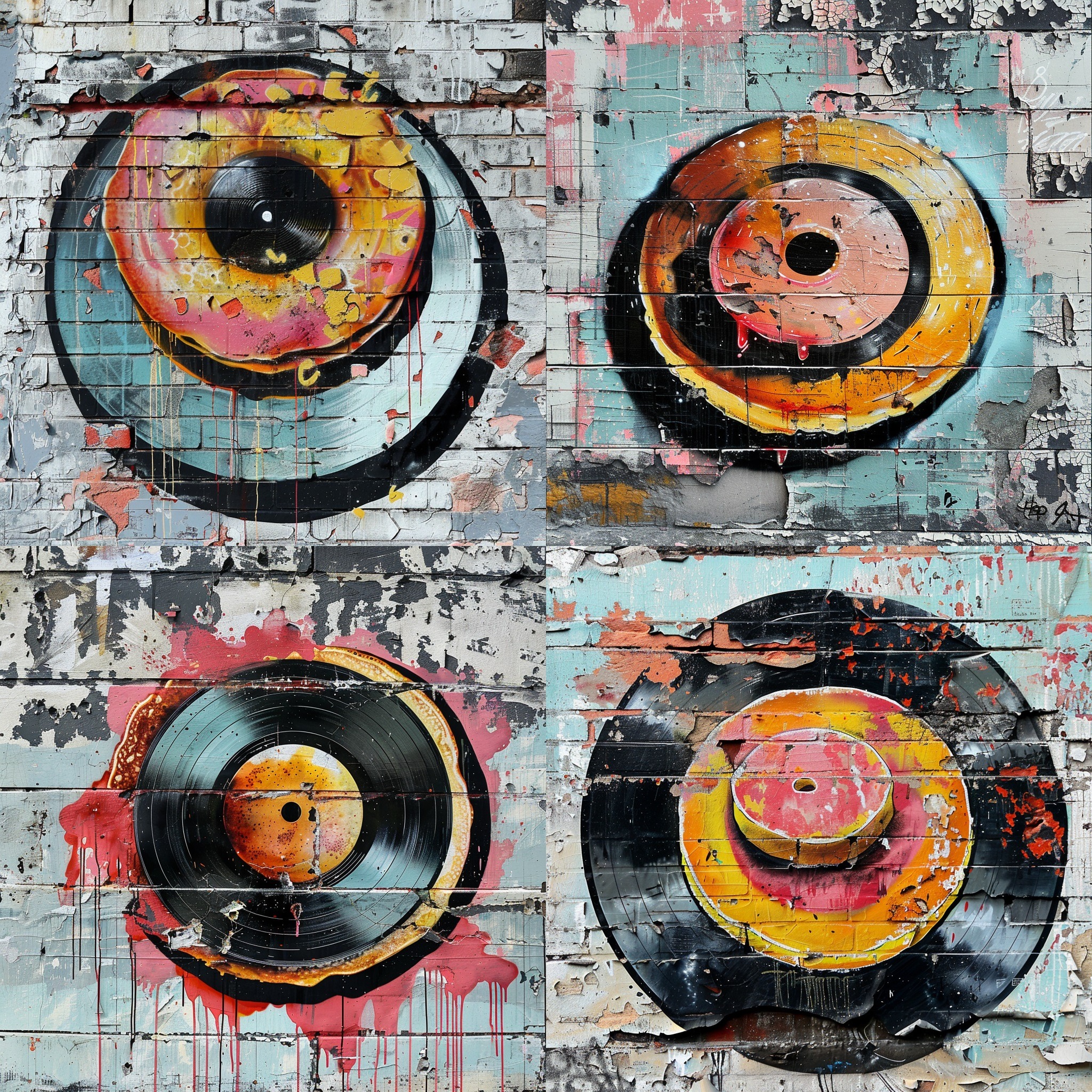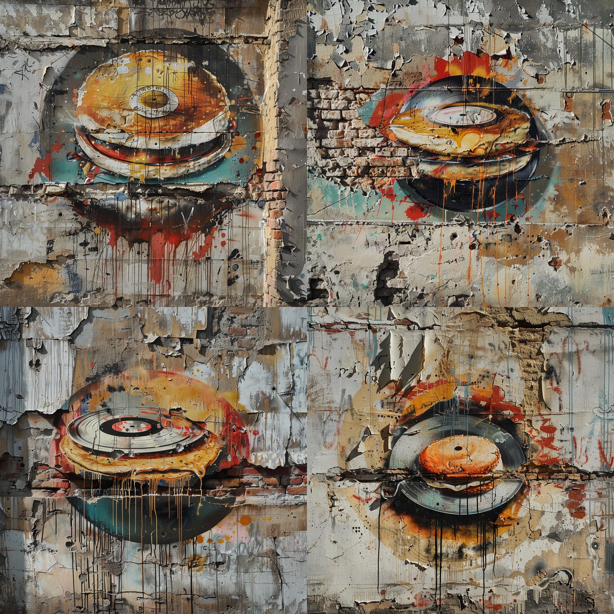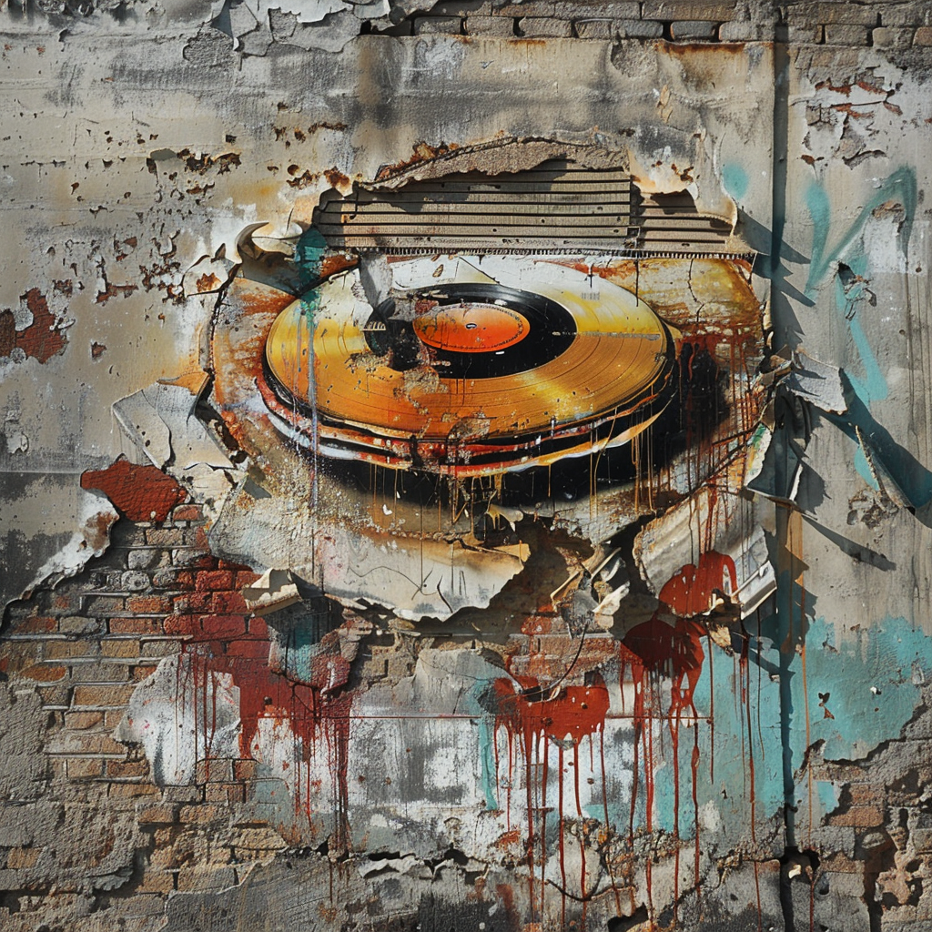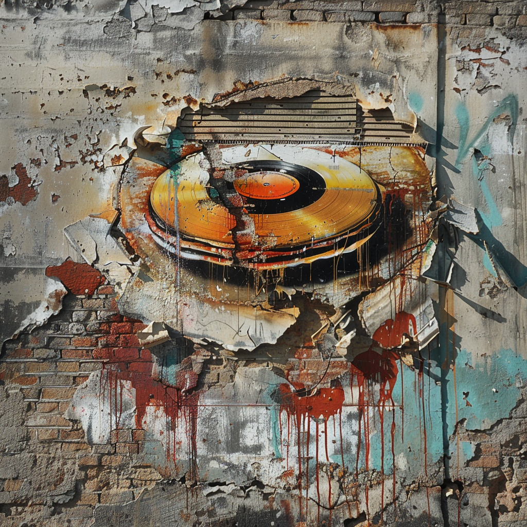 A photorealistic depiction of a graffiti on a crumbling plaster wall of an abandoned building, showcasing an edible pancake designed like a classic vinyl record, embodying minimalism. The background subtly hints at the building's forgotten history with faded letters and numbers. The pancake-record is detailed, with syrup grooves mimicking record grooves, under soft, diffused lighting. Created Using: digital painting, realism, attention to texture detail, photorealistic shading, ambient lighting, subdued color palette, historical undertones, tactile realism