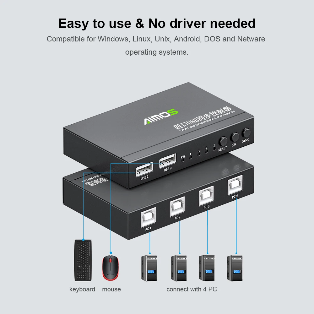 cpAwxSeHHere you can buy AIMOS AM-KM402 4 Ports USB Synchronizer USB Keyboard Mouse Synchronous Controller Aluminum Alloy KVM Switcher Wide Compatibility with free delivery to your post office.