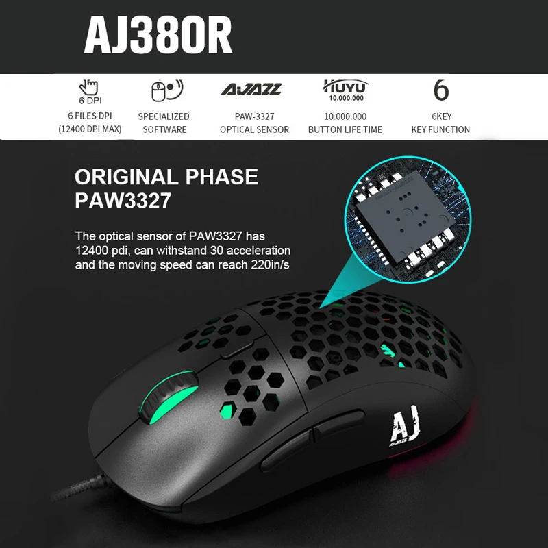 «AJAZZ Aj380 New Light Weight Wired Mouse 10000DPI 16000DPI Gaming Mouse Aj380R Hollow-out Design 6 Keys Adjustable 6 DPI Mice» по лучшей цене на рынке! Всего за 35$ (3325рублей)