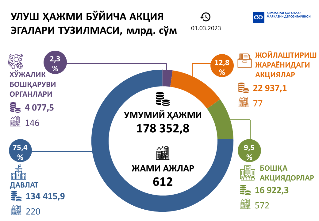 Давлат улушининг умумий ҳажми эса 88,4 млрд.сўмга камайди ва 134 415,9 млрд.сўмни ёки акция чиқарилишлари умумий ҳажмининг 75,4 фоизини ташкил этди. Давлат улуши мавжуд бўлган акциядорлик жамиятларининг умумий сони 1 тага камайди ва 220 тани ташкил этди.