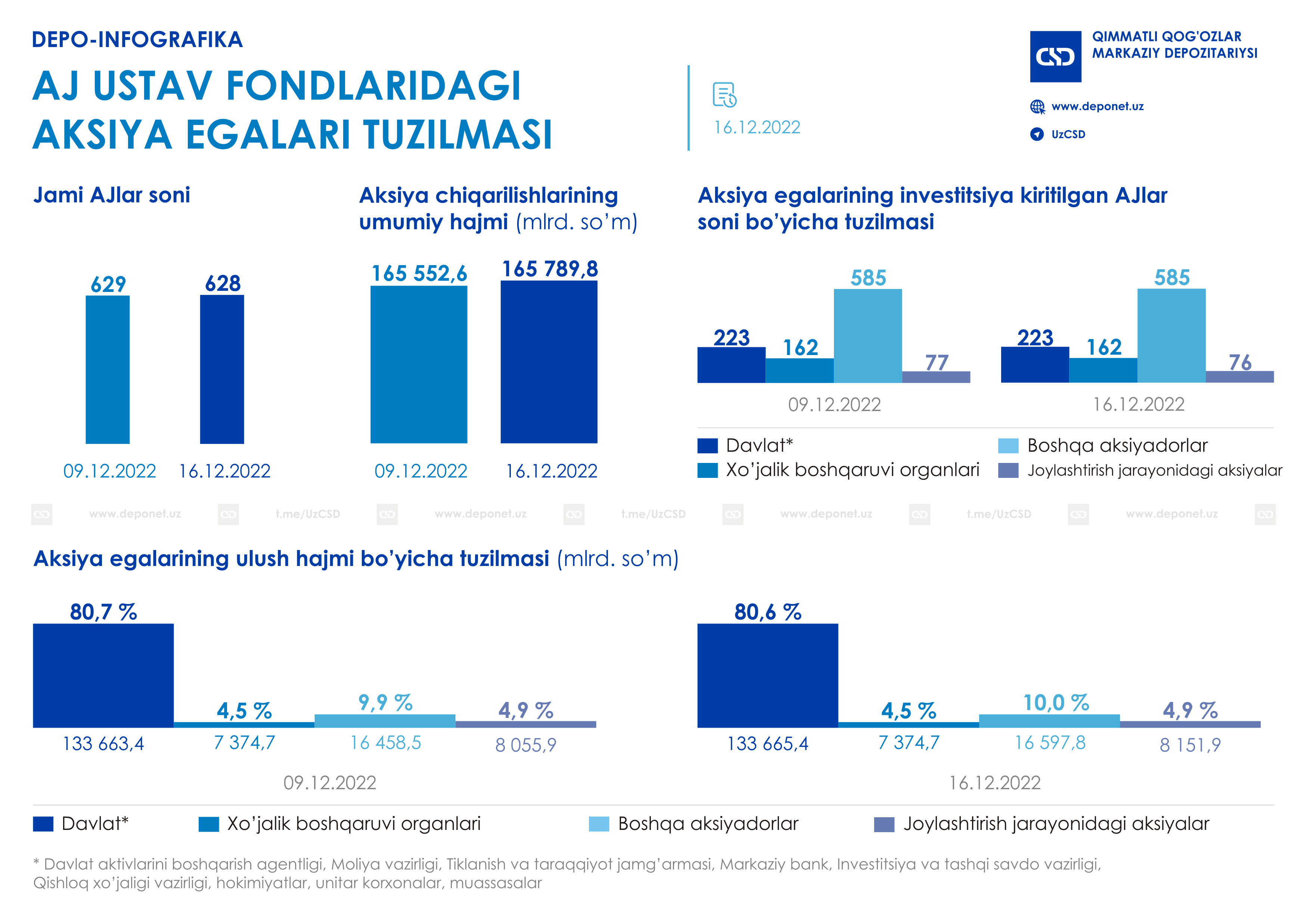 Hafta yakunlariga, ya’ni 16.12.2022 yildagi holatga ko’ra, AJlarning umumiy soni 628 ni tashkil etdi. Aksiya chiqarilishlarining umumiy hajmi esa 165 789,8 mlrd. so’mni tashkil etdi.