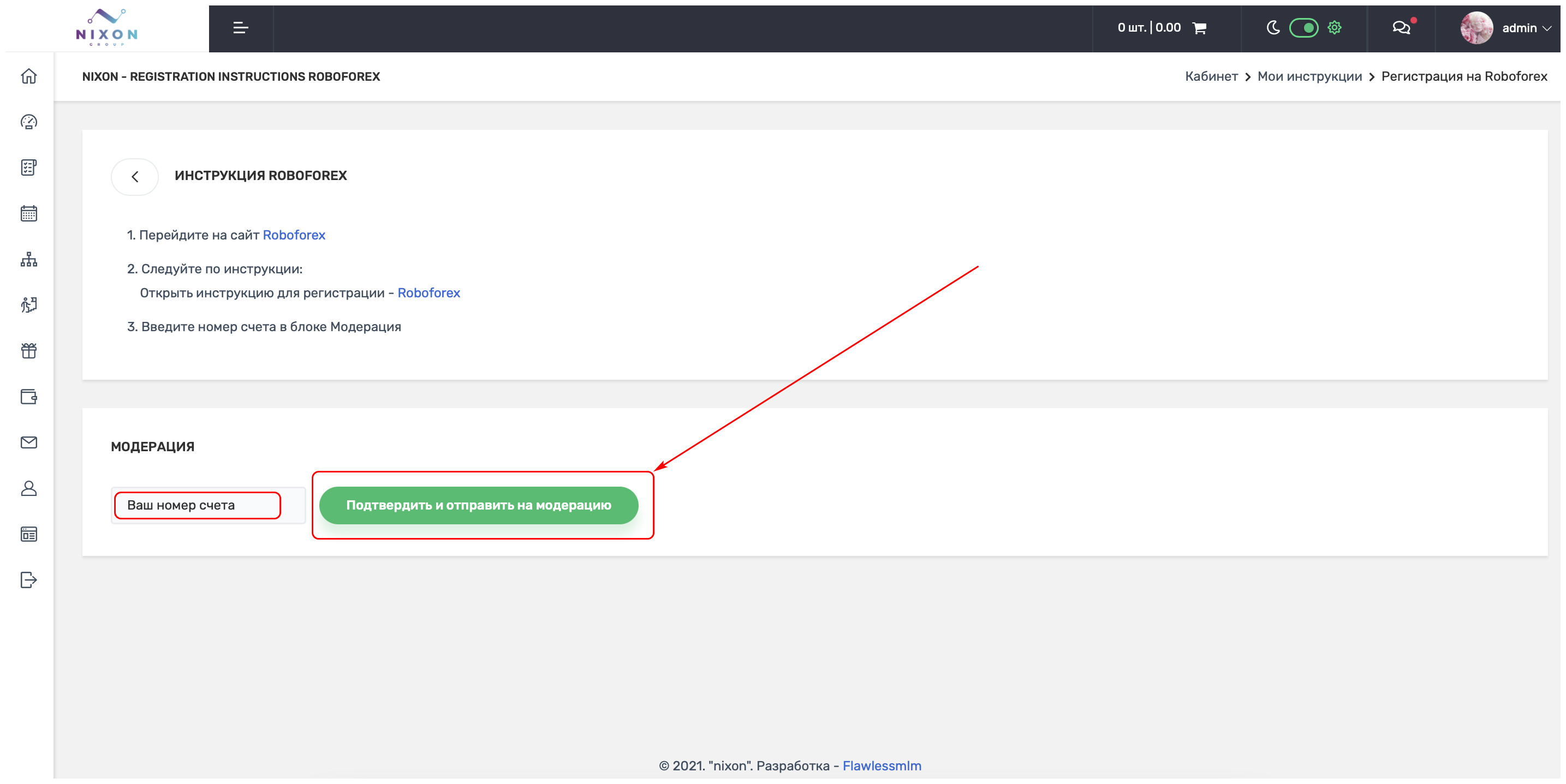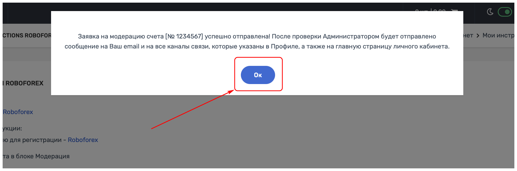 В блоке "МОДЕРАЦИЯ" набираете номер вашего торгового счёта и нажимаете на кнопку "Подтвердить и отправить на модерацию"