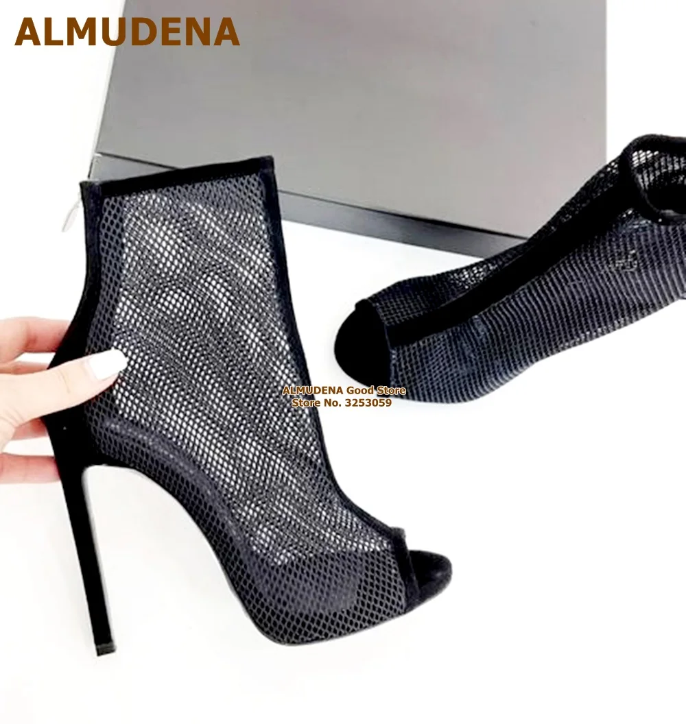 "ALMUDENA Black Network Ankle Boots Thin High Heel Open Toe Caged Short Booties Suede Patchwork Mesh Dress Shoes Size46 Dropship" * Buy Now Just For 62$