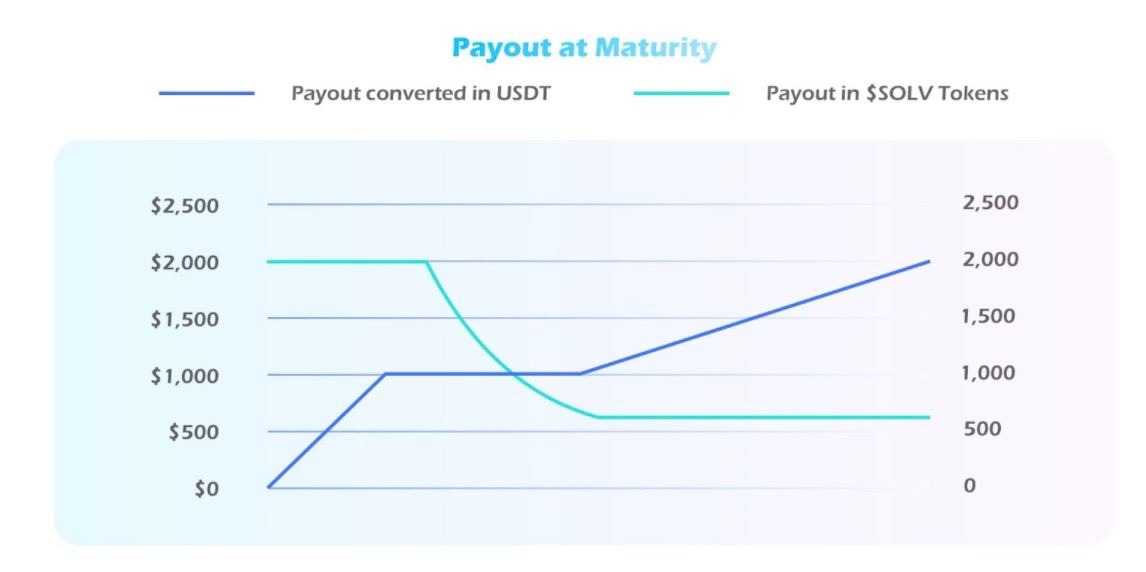 If the settlement price ends up anywhere over $1.50 (upper bound), the holder receives a fixed payout 666.67 SOLV, generating a ROI of at least 25%. If the settlement price drops below $0.50 (lower bound), the holder receives a fixed payout of 2000 SOLV and a negative ROI.