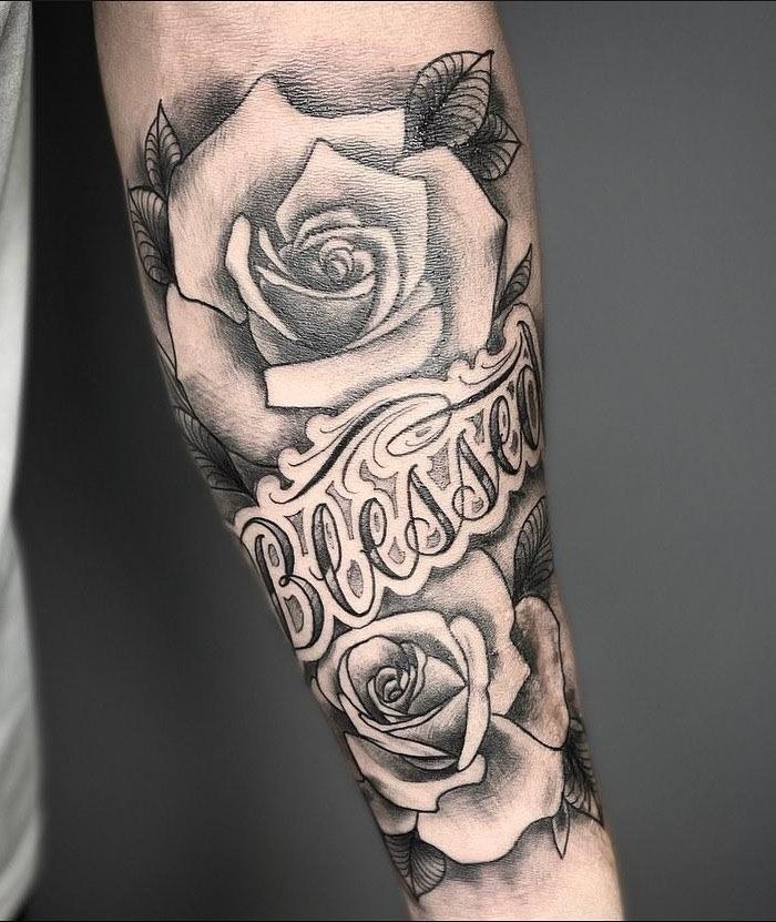 What a powerful background! Black and gray always give the tattoo a sense of seriousness. The meaning of blessed tattoos is immense, and the design of this tattoo is perfect. You won't regret having enough space for such a tattoo on your arm. You should see those shadows - it's a real work of art!