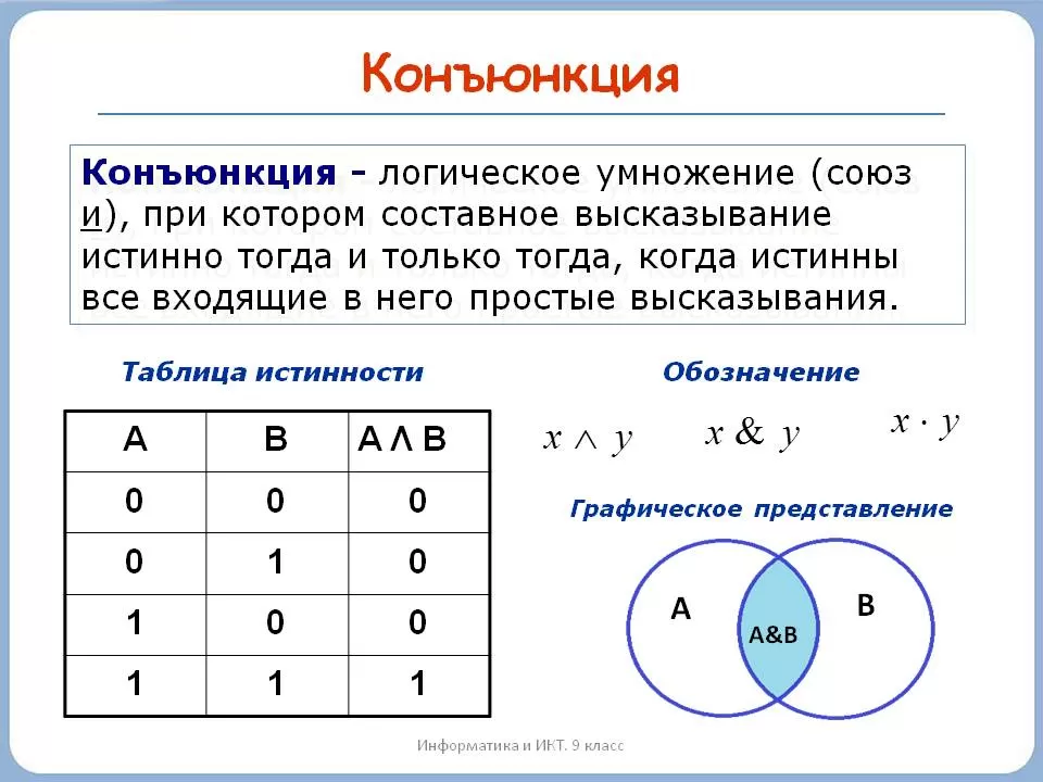Синонимы: логи́ческое "И", логи́ческое умноже́ние, иногда просто "И" . Это бинарная инфиксная операция, то есть, она имеет два операнда и ставится между ними . Чаще всего встречаются следующие варианты записи: && & .