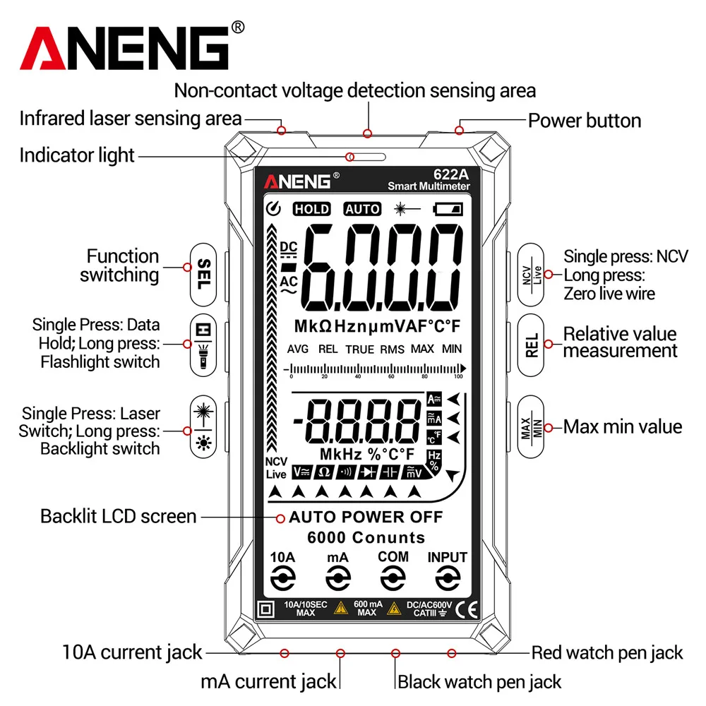 ANENG 622A 6000 Counts Infrared Laser Smart Multimeter AC/DC Voltage Meter Current Meter NCV Detector Diode Hz Temp Capacitor - Купить с бесплатной доставкой