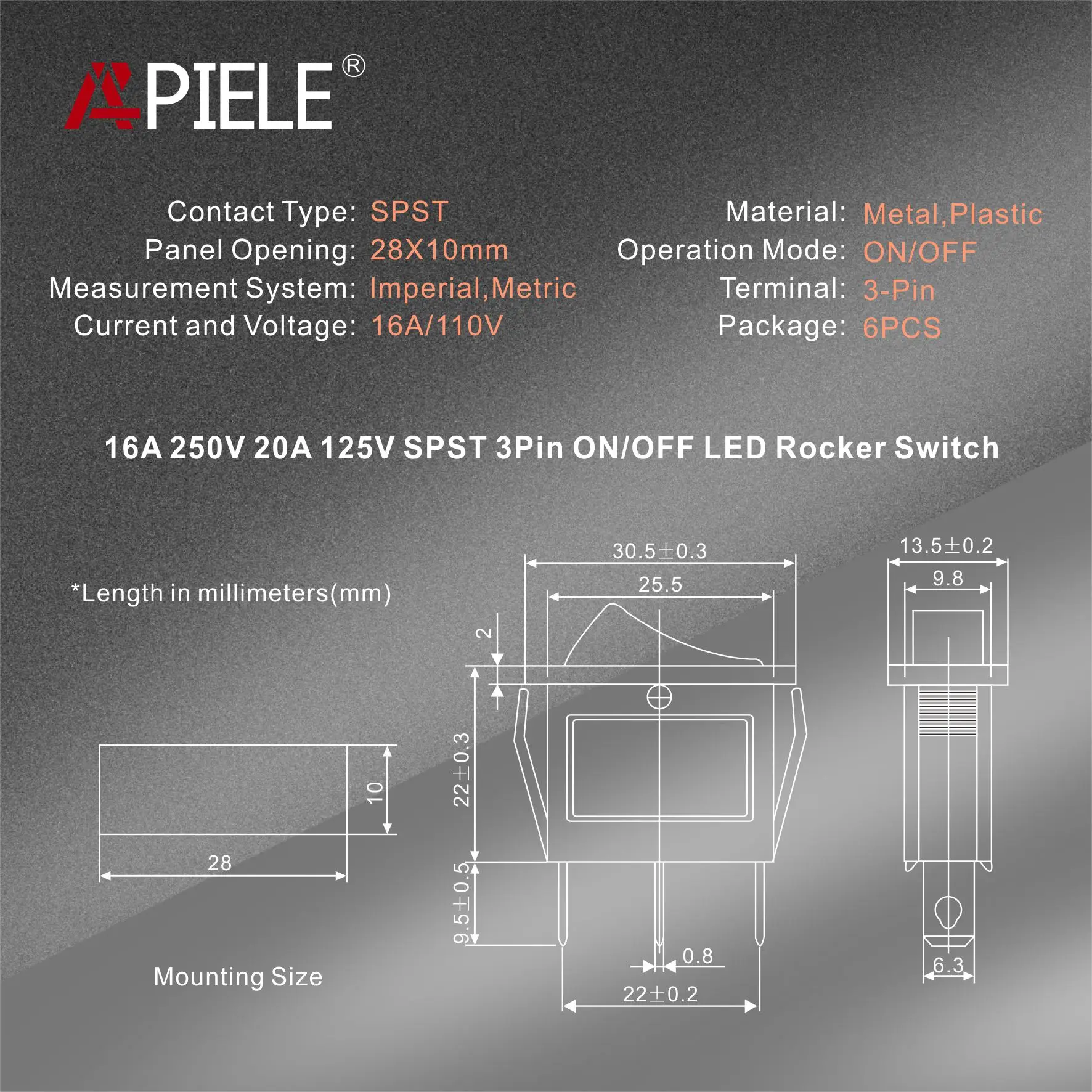 APIELE ON-Off Rocker Toggle Switch AC 125V/20A, 250V/16A with LED Light SPST 3 Pins 2 Position 6Pcs KCD3-101N - Купить с бесплатной доставкой