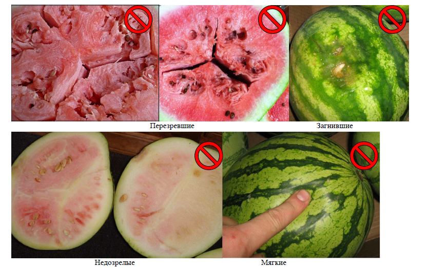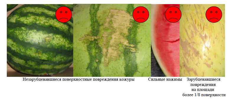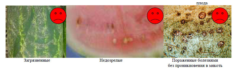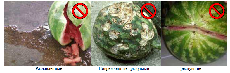 Плоды загнившие и гнилые, пораженные болезнями и вредителями вглубь плода, поврежденные грызунами, треснувшие, раздавленные, помятые (помятым считается плод арбуза, у которого на разрезе мякоть потемневшая, отделившаяся от кожуры), перезревшие, забродившие, незрелые (непригодные к употреблению – с бледно-розовой или белой мякотью), подмороженные.