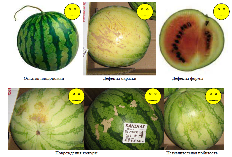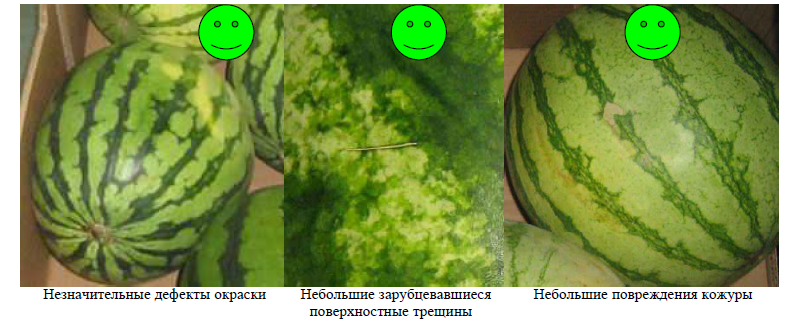 Плоды с дефектами формы, дефектами окраски (бледная окраска той части арбуза, которая соприкасалась с почвой во время выращивания, дефектом не считается), остатками плодоножки длиннее 5 см, зарубцевавшимися поверхностными трещинами, повреждениями кожуры (пробковые образования, потертости, царапины) на площади не более 1/8 поверхности плода, плоды с незначительной побитостью.