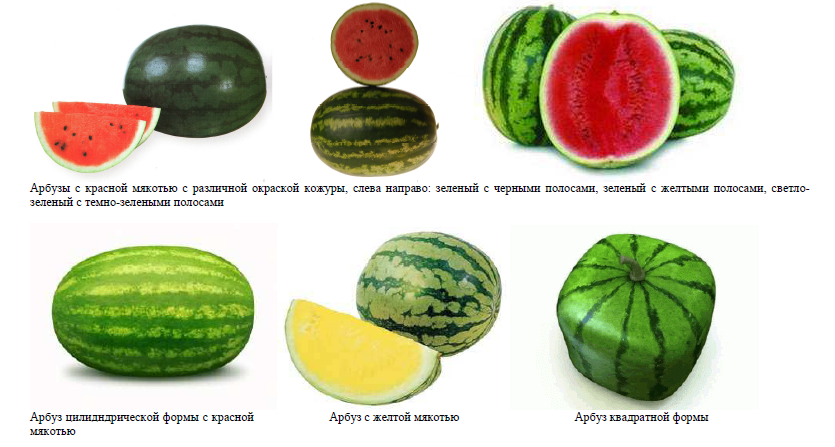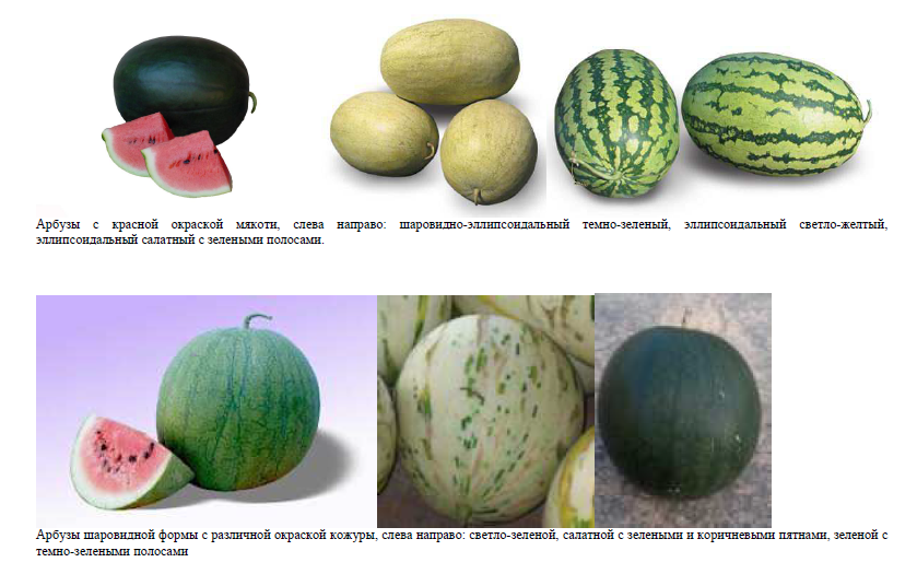 Основными идентификационными признаками сортов арбуза являются форма, размер, окраска, рисунок поверхности, консистенция, вкус мякоти, транспортабельность и лежкость плодов, толщина коры, скороспелость. По форме плоды арбузов бывают шаровидными, эллипсоидальными, цилиндрическими, сплюснутыми; выведены также сорта с квадратной формой плода. По размеру плоды арбузов бывают крупные (диаметр более 22 см), средние (18-22 см) и мелкие (менее 18 см). По толщине коры плоды арбузов бывают тонкокорые (0,5-1 см), с корой средней толщины (1-1,5 см) и толстокорые (более 1,5 см). Окраска арбузов может быть от белой до темно-зеленой и желтой; рисунок – в виде полос, пятен, сетки. Окраска мякоти может быть красной, оранжевой, желтой или белой.