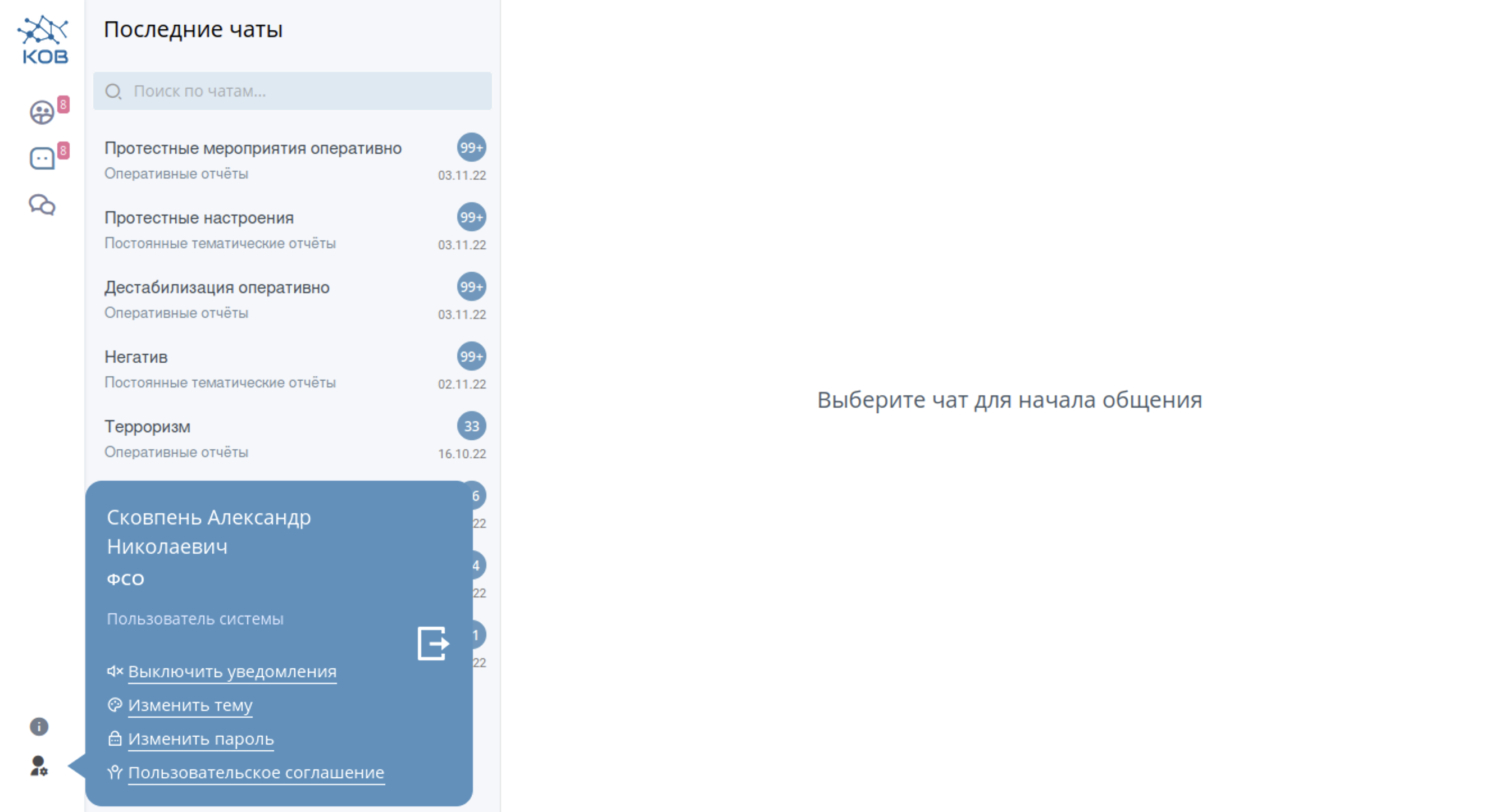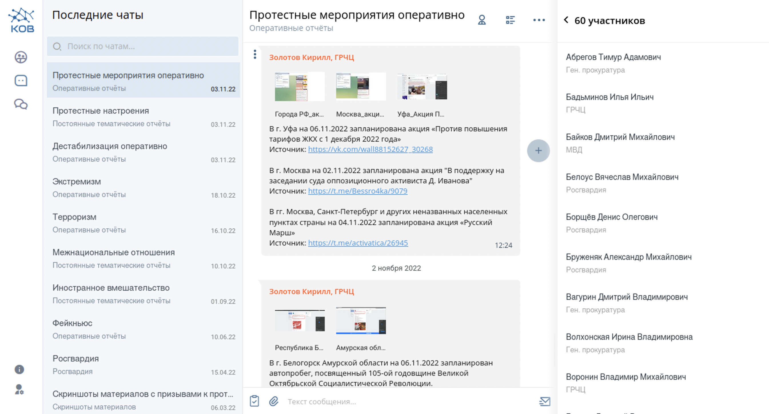 Тематические чаты в системе КОВ посвящены протестным мероприятиям и настроениям в обществе, якобы фейкам о войне в Украине и другим темам, которые интересуют служащих репрессивного аппарата. Участники могут прикреплять медиафайлы и делится ссылками. У каждого пользователя есть возможность оперативно написать любому, кто имеет доступ к системе.