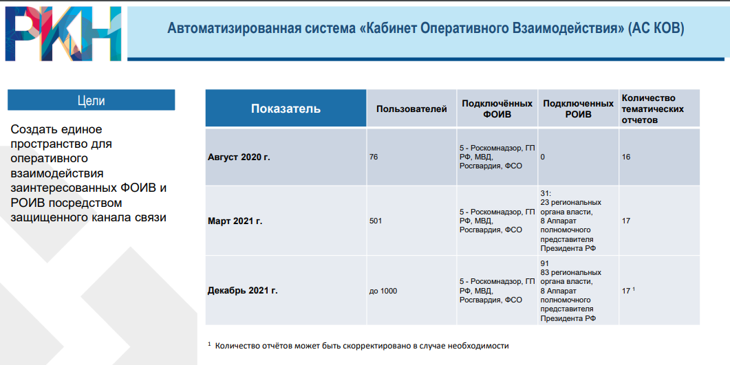 А чтобы его сотрудники могли быстрее передавать отчеты в Генпрокуратуру, МВД, ФСБ, администрацию Кремля и другие заинтересованные ведомства, была разработана автоматизированная система под названием «Кабинет оперативного взаимодействия», сокращенно – АС КОВ. Нечто вроде тайного мессенджера, с помощью которого сотрудники выше перечисленных структур обмениваются сообщениями о готовящихся акциях протеста, обнаруженных в сети призывах, протестных настроениях и так называемых фейках.