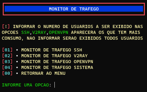 O Monitor de trafego ssh monitora a partir do momento que abre ele, não roda em background, o Monitor de trafego openvpn e v2ray monitora a partir do momento que o usuÔrio conecta, e o Monitor de trafego do sistema exibe todo trafego de todas interfaces de rede do sistema.