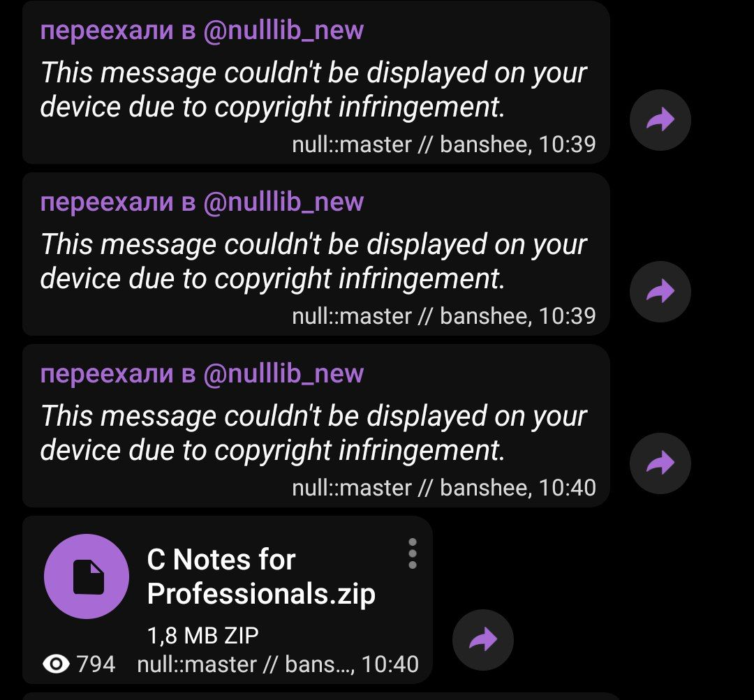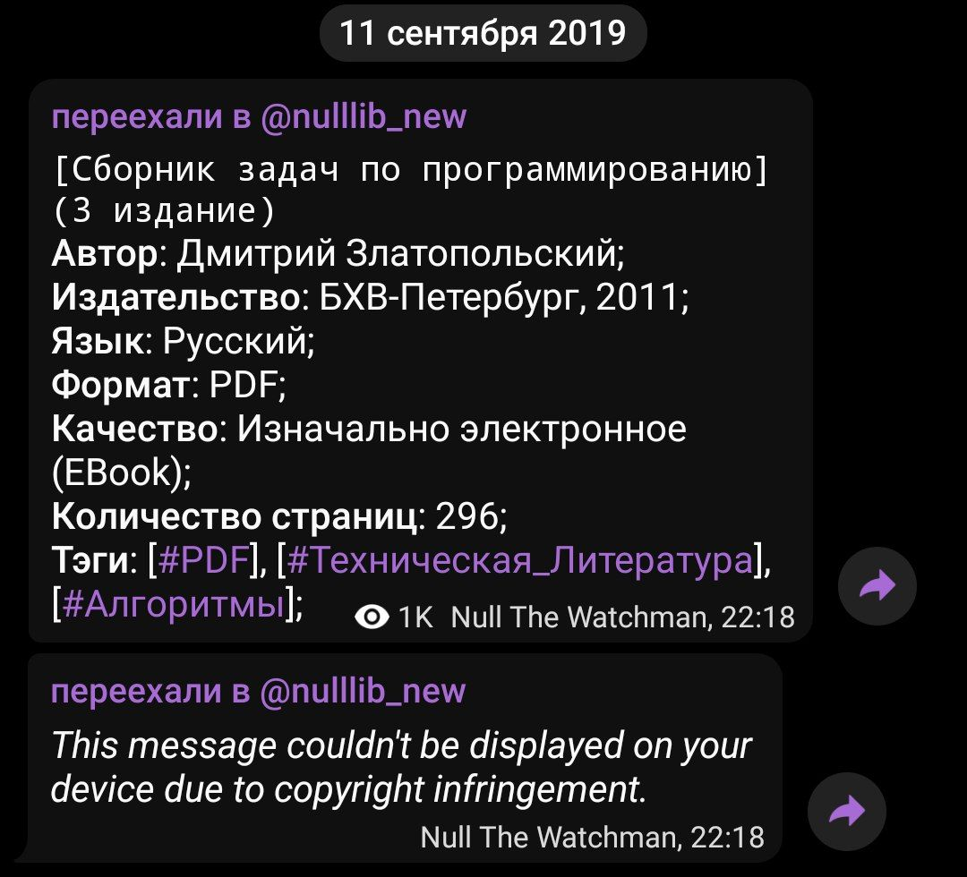 Чем же мне они насолили? Без суда и следствия они закрыли все мои записи меткой "This message couldn't be displayed on your device due to copyright infringe". Под раздачу попали и текстовые публикации (без файлов), и книги с открытой лицензией (например, коллекция книг от goalkicker.com), сочинения Достоевского и архив распавшегося издательства "Ультра.Культура".