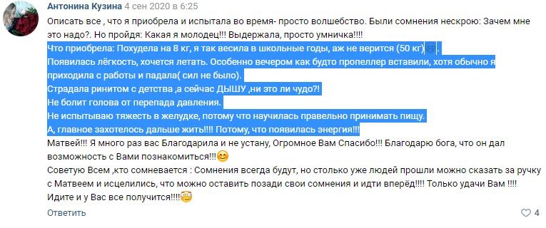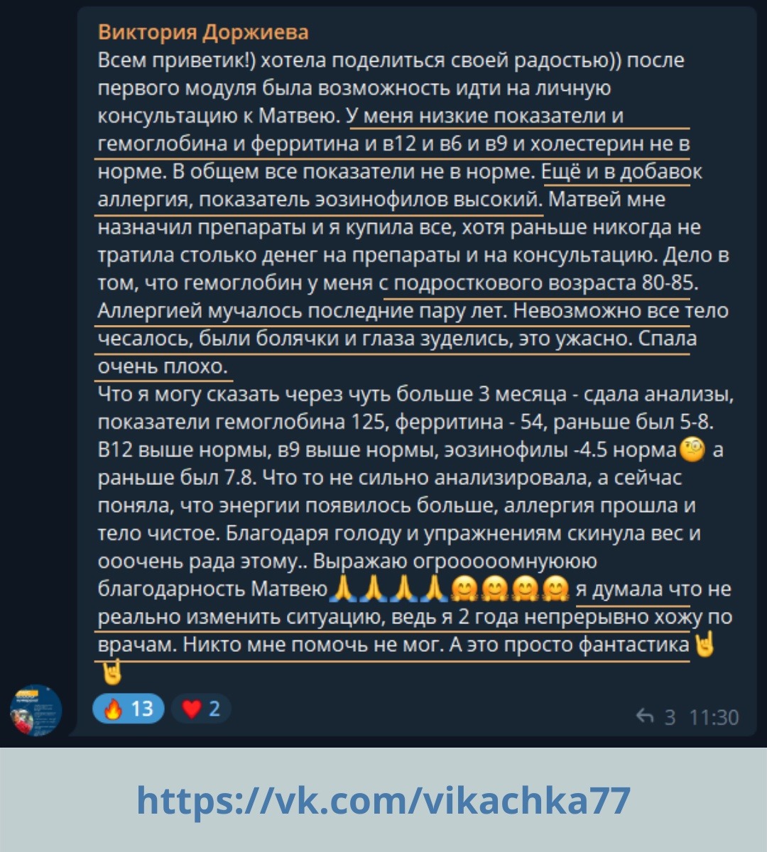 Среди моих клиентов есть те, кто избавился от диабета, псориаза, хронической усталости, ожирения, инсулинорезистентности, истощения и таких проблем, при которых обычно назначают хирургические операции. Разумеется, все кто хотел нормализовать вес - пришли в здоровую норму. Часть отзывов можно почитать здесь: https://vk.com/board136946017. Их сотни, для наглядности закину пару прямо сюда: