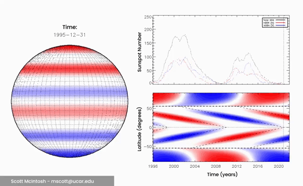 LINKS: Entgegengesetzt geladene Magnetbänder, dargestellt in Rot und Blau, marschieren über einen Zeitraum von 22 Jahren in Richtung Äquator. Wenn sie sich am Äquator treffen, vernichten sie sich gegenseitig.