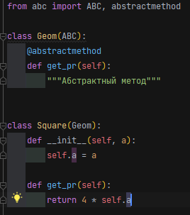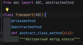 Для этого наследуем базовый класс от класса ABC и над абстрактными методами ставим декоратор @abstractmethod.