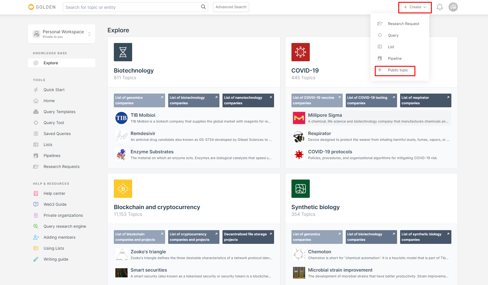 Как только вы зарегистрировались, на сайт Golden жмём "Create" и выбираем "Public Topic"
