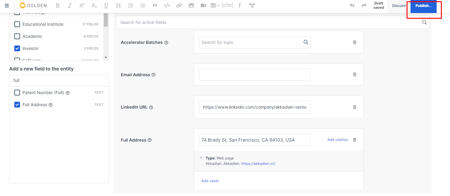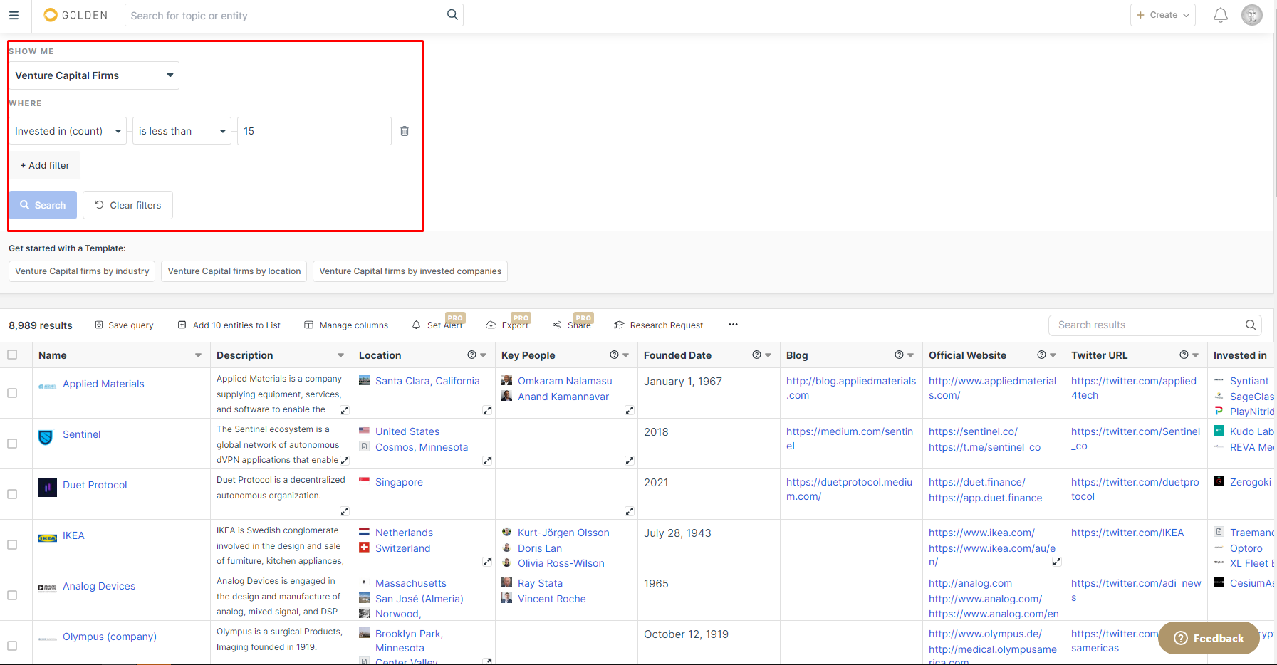 Заходим в "Advanced Search" на главной странице и ищем по различным критериям, допустим будем искать венчуры и дополнять их инвесты или другую информацию.