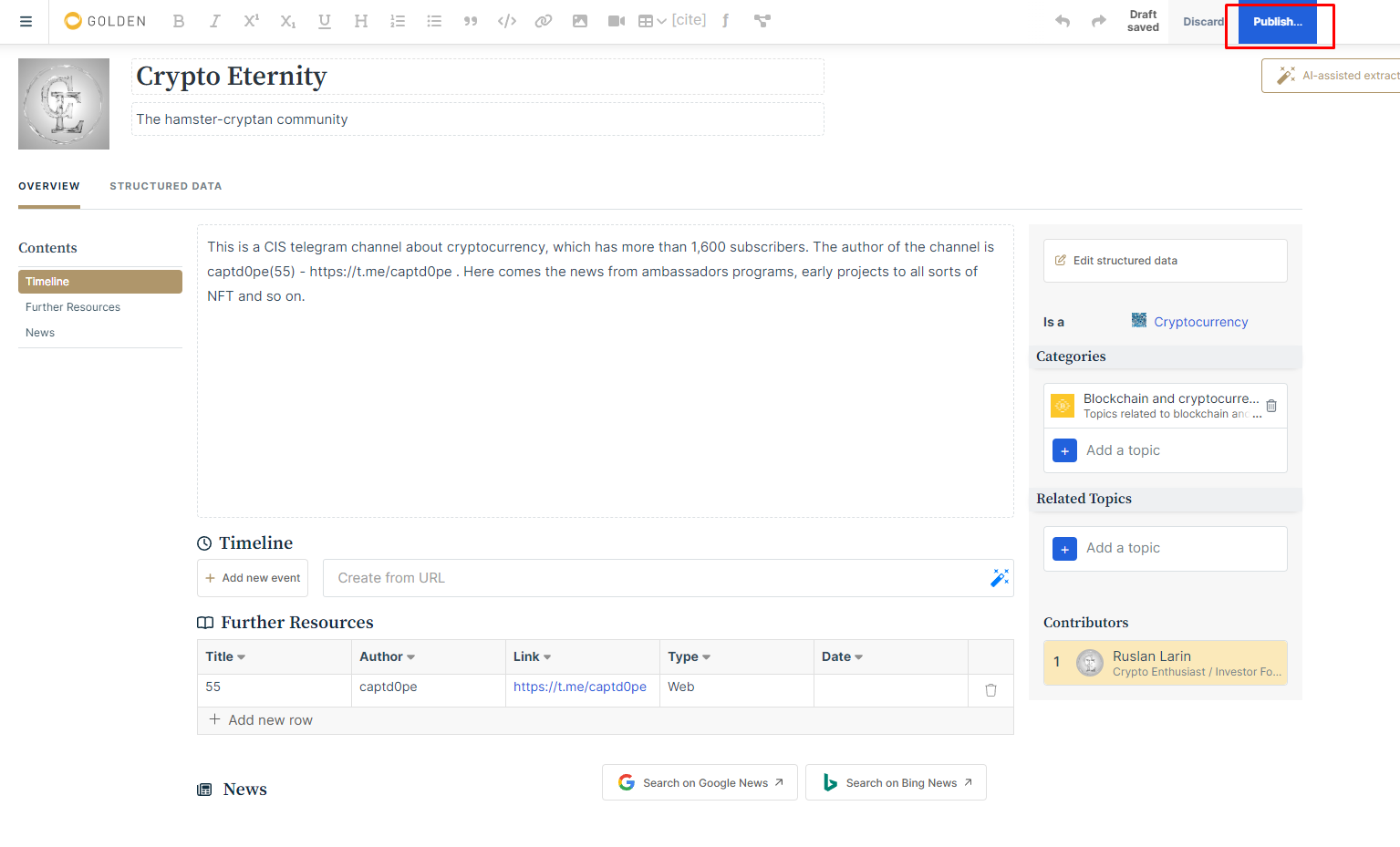Сейчас в проекте идёт некая комьюнити программа, в рамках которой за различные активности мы будем получать поинты, которые в дальнейшем обменяются на токены проекта: "Каждый агент может отправить триплеты для проверки, и, если они будут приняты, он получит токены в награду." Но вы можете писать только о том, чего нет уже на Golden. То есть всякие ранние проекты, токены и так далее. За написание чего то нового - от 2-3 токенов, за редактирование - от 1-2 токенов.