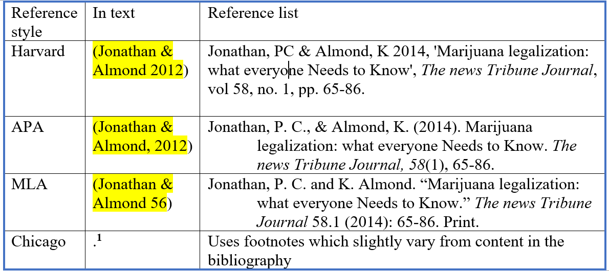 Note, references appear in an essay in two forms the in text citation and the reference list. The in text citation is a short representation of the reference inside an essay/report while the reference list gives complete detail. The referencing styles determine how an in text looks like, how the reference list appears and how the paper is formatted. Below is a simple summary of the referencing styles.