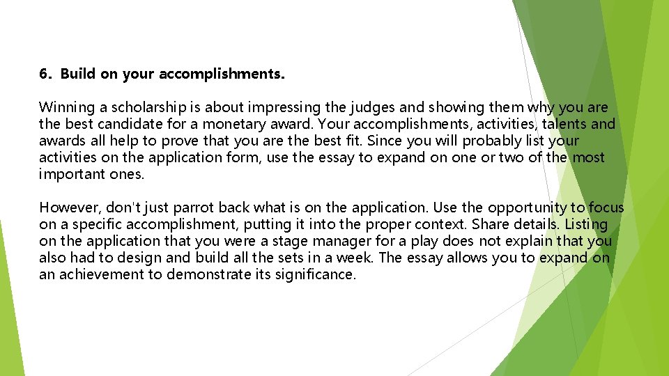Most of what is applicable to writing a successful personal growth essay holds here for Accomplishment pieces: Colleges use the relation of accomplishments to get insight into applicants' personalities and character traits . Some schools ask targeted questions, while others leave the topic open for applicant interpretation .