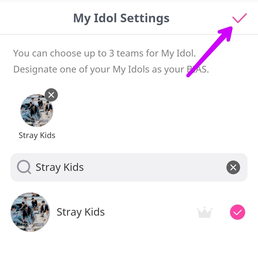 Теперь нужно выбрать артиста, которого поддерживаете: вводите в строку «Stray Kids» и выбираете, в правом верхнем углу нажимаете галочку. Затем соглашаетесь (confirm).